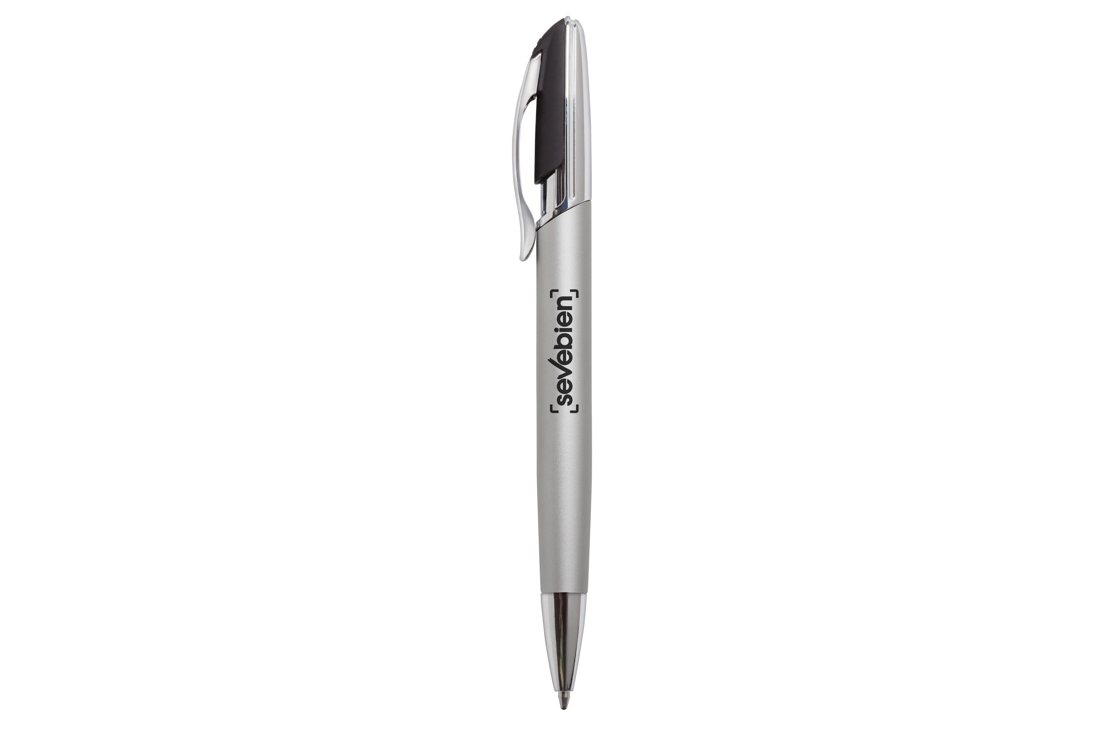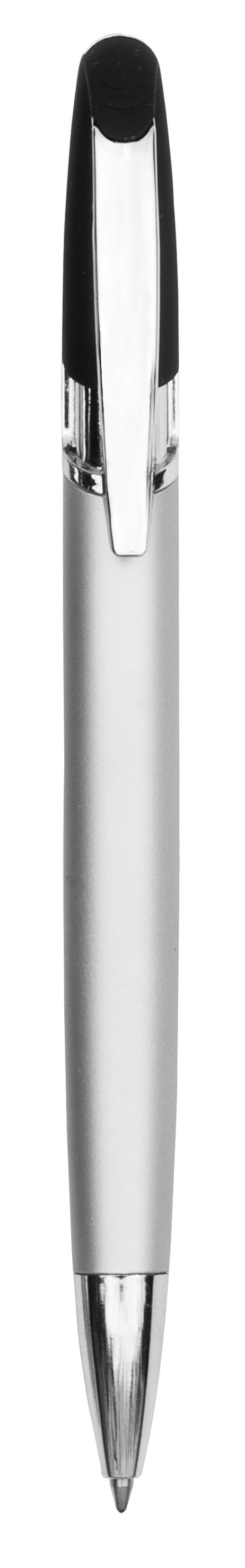 Aluminio. Cuerpo en aluminio opaco. Pulsador y puntera plásticos color plata brillante. Clip metálico.Tinta negra. Electroplateado.