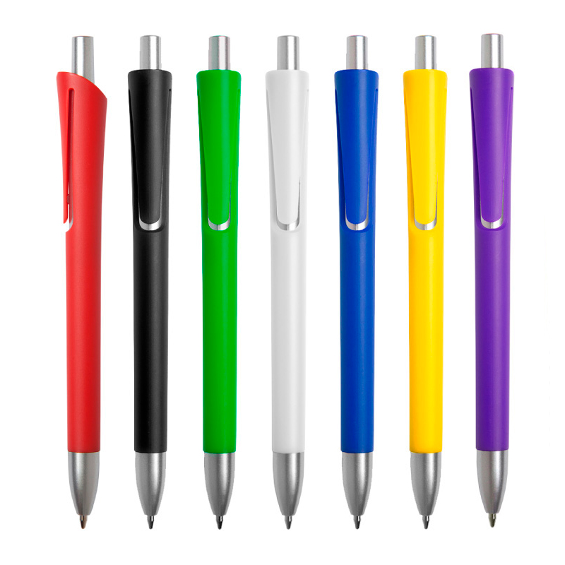 Plástico. Bolígrafo con cuerpo plástico de color, botón pulsador y puntera color plata. Tinta negra.