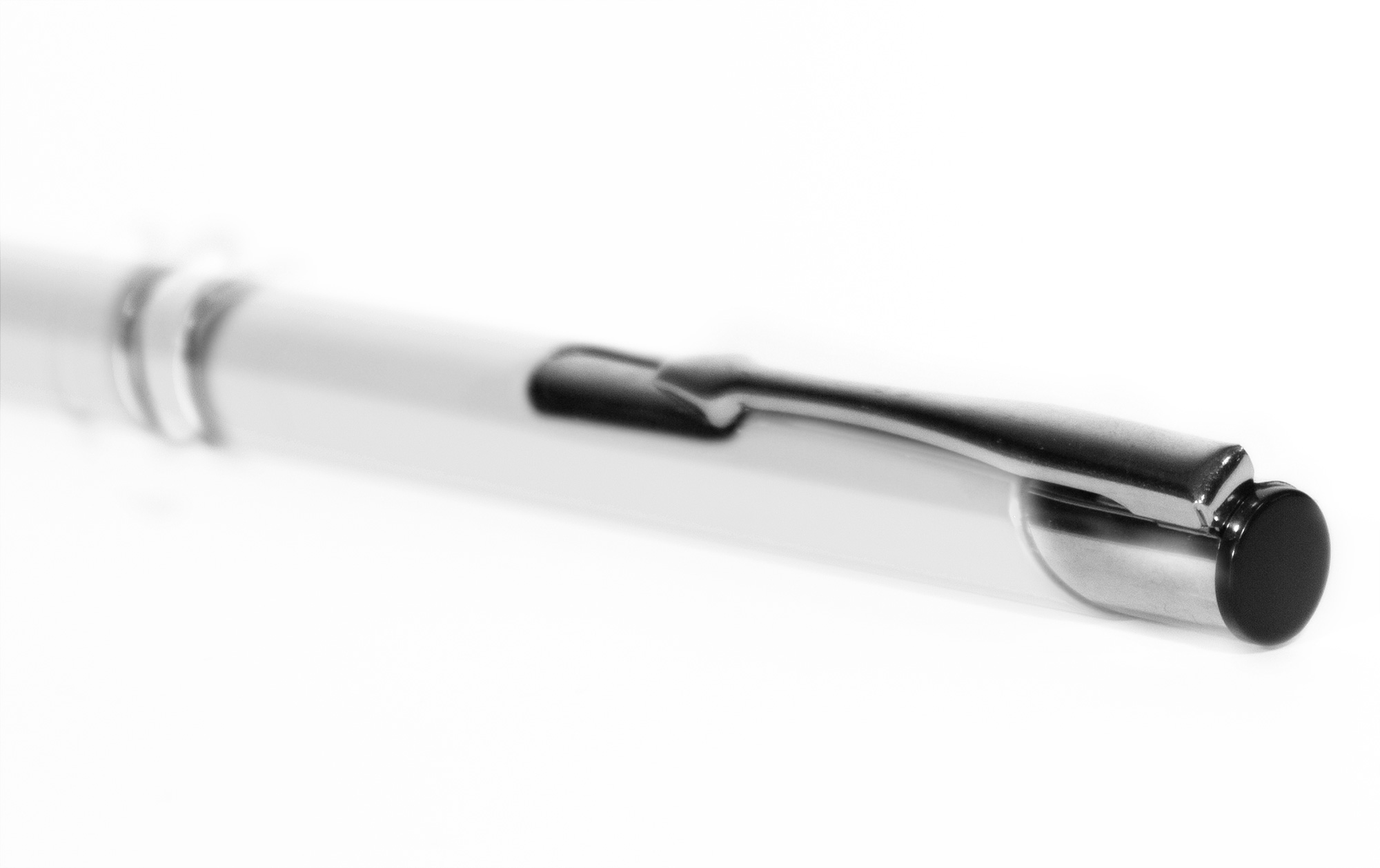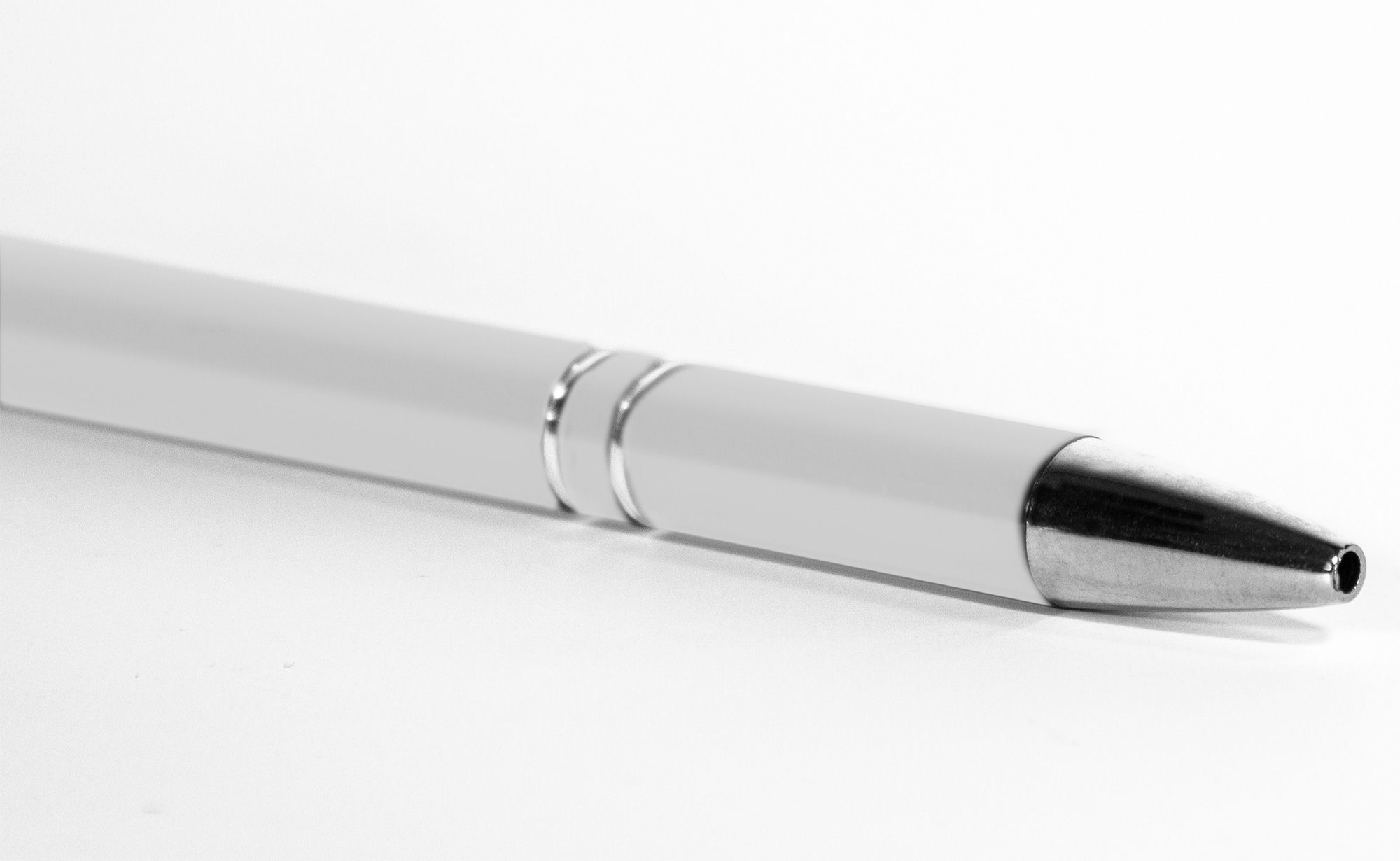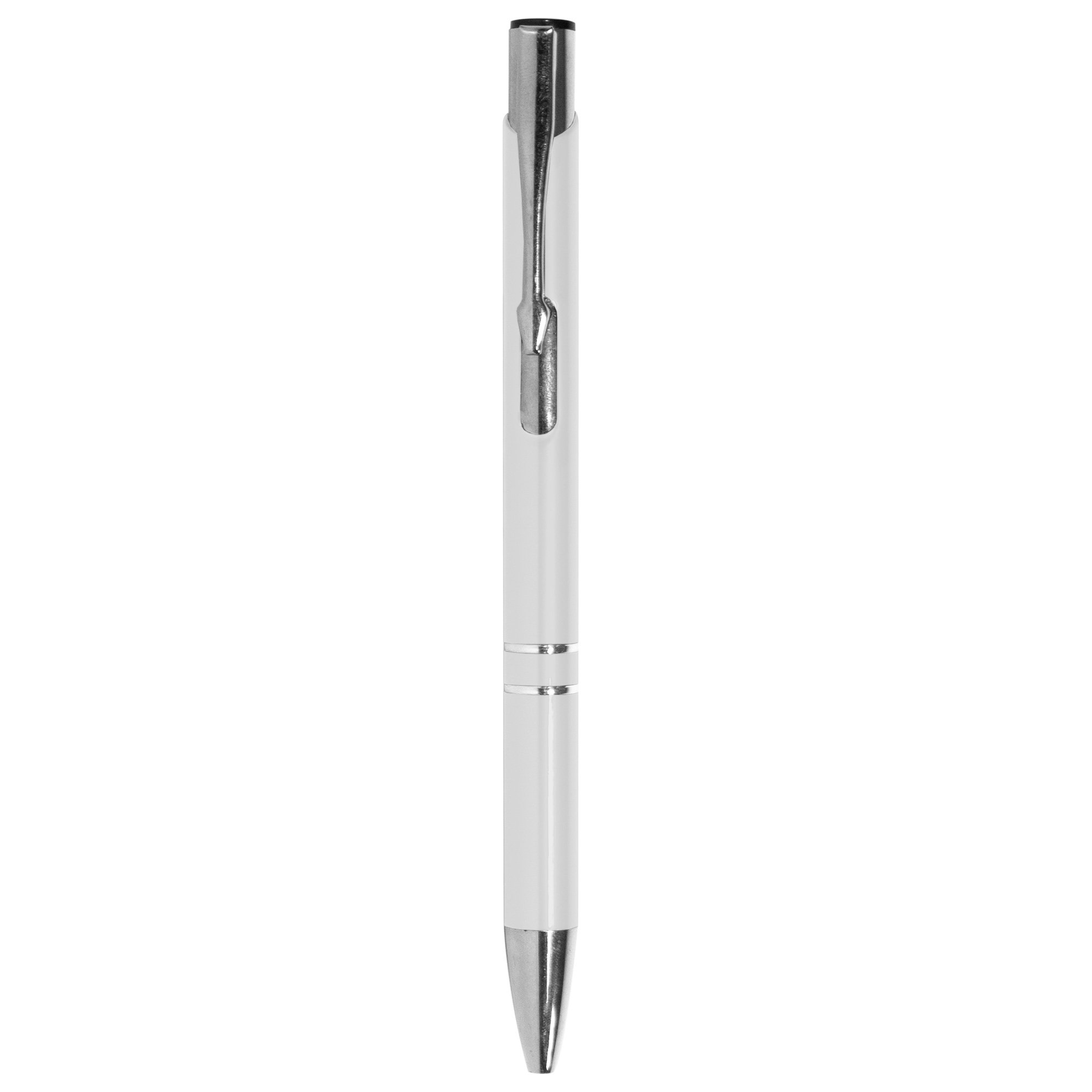Aluminio. Cuerpo metálico de color. Clip, punta, y pulsador color plata. En el centro del bolígrafo cuenta con dos arandelas y más arriba finalizando el clip cuenta con una muesca color plata. Tinta negra