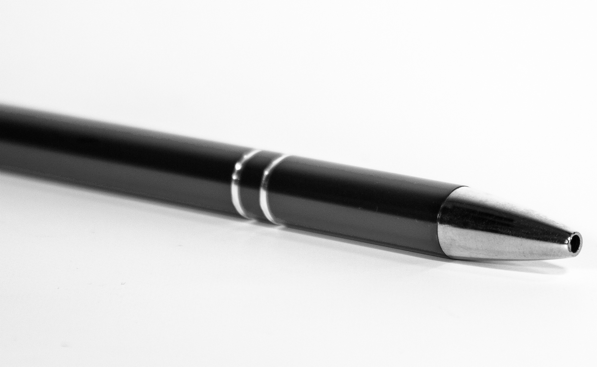 Aluminio. Cuerpo metálico de color. Clip, punta, y pulsador color plata. En el centro del bolígrafo cuenta con dos arandelas y más arriba finalizando el clip cuenta con una muesca color plata. Tinta negra