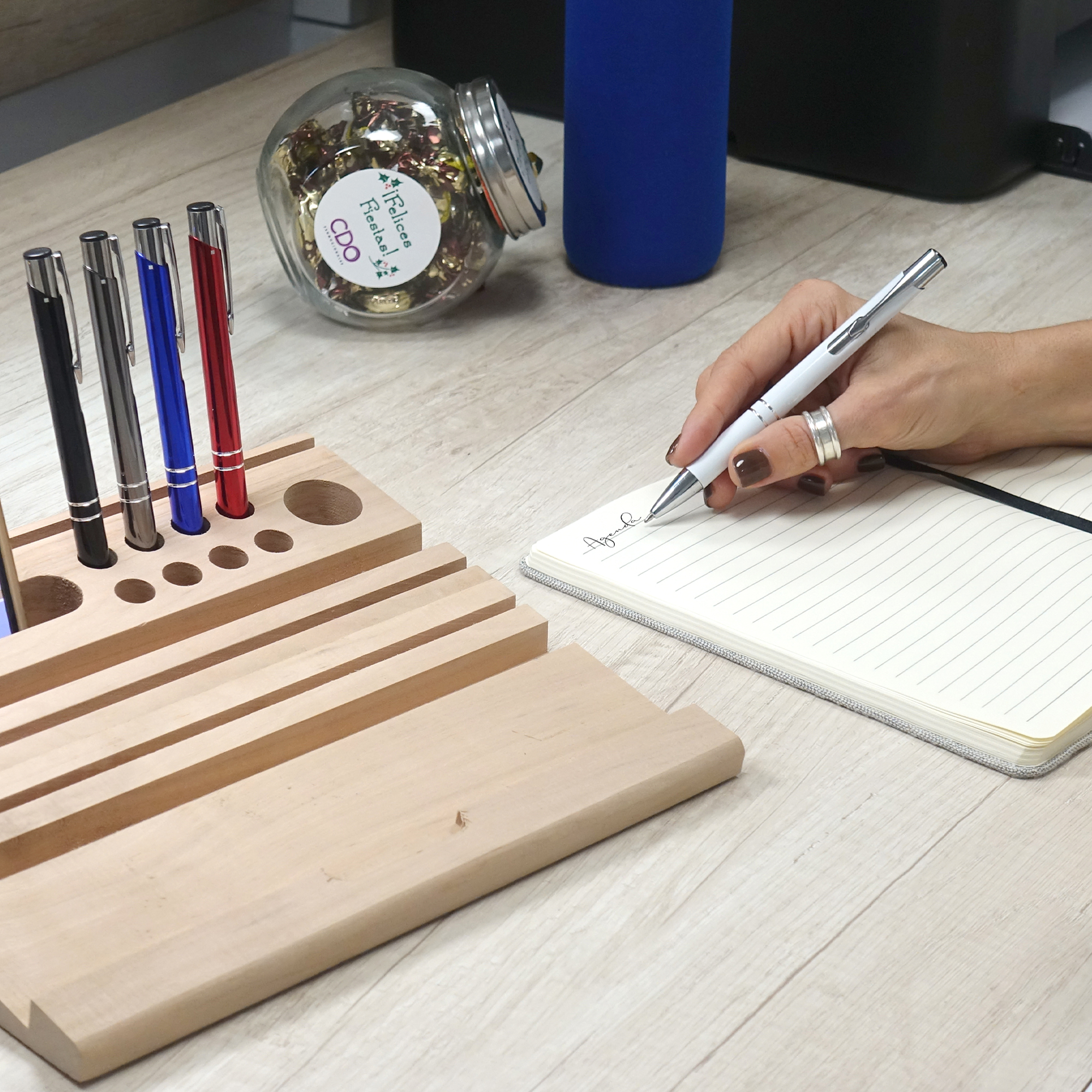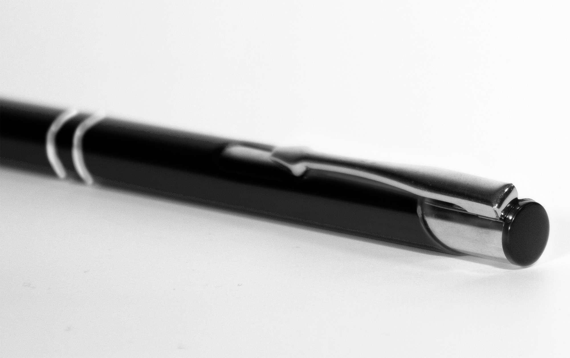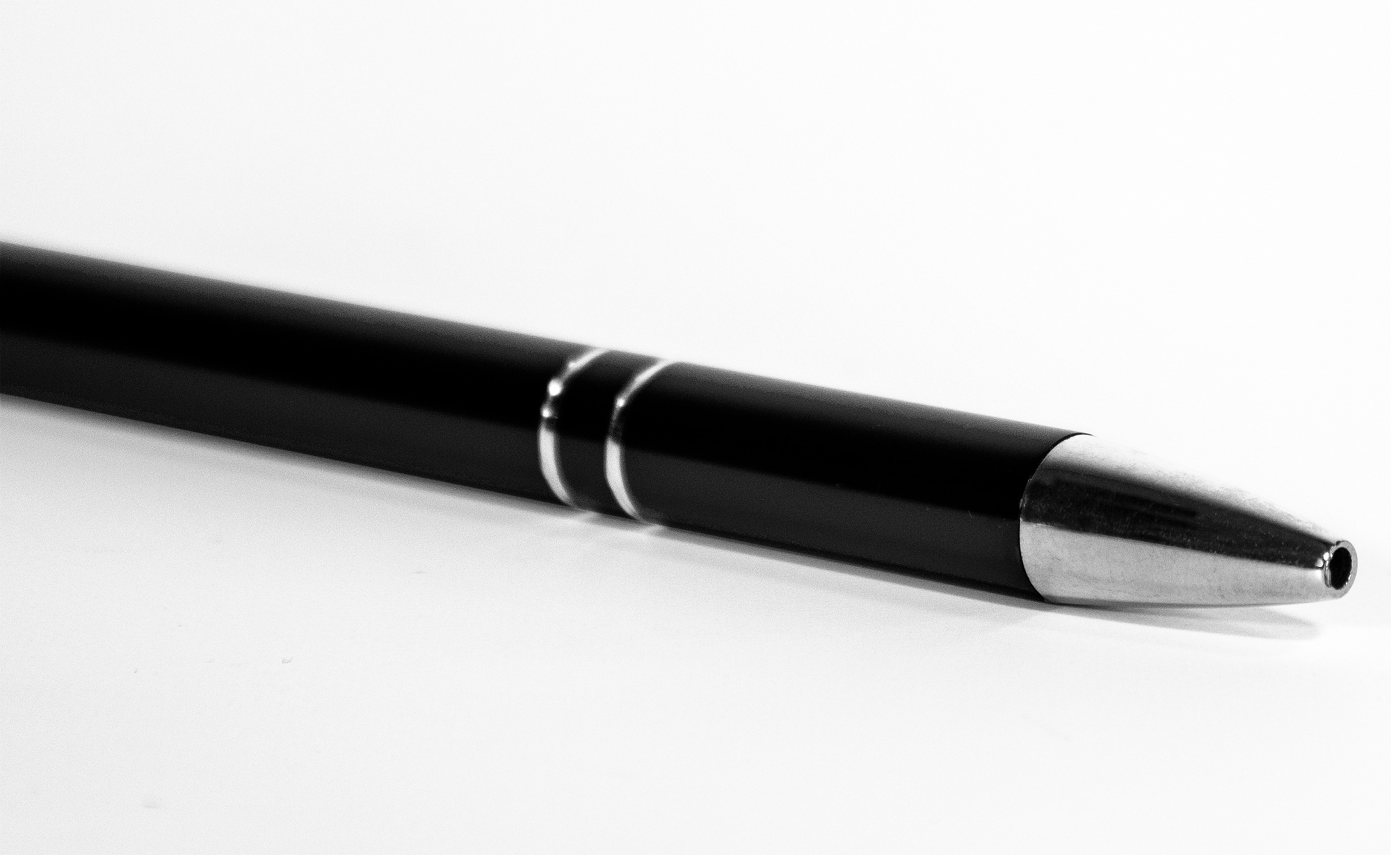 Aluminio. Cuerpo metálico de color. Clip, punta, y pulsador color plata. En el centro del bolígrafo cuenta con dos arandelas y más arriba finalizando el clip cuenta con una muesca color plata. Tinta negra