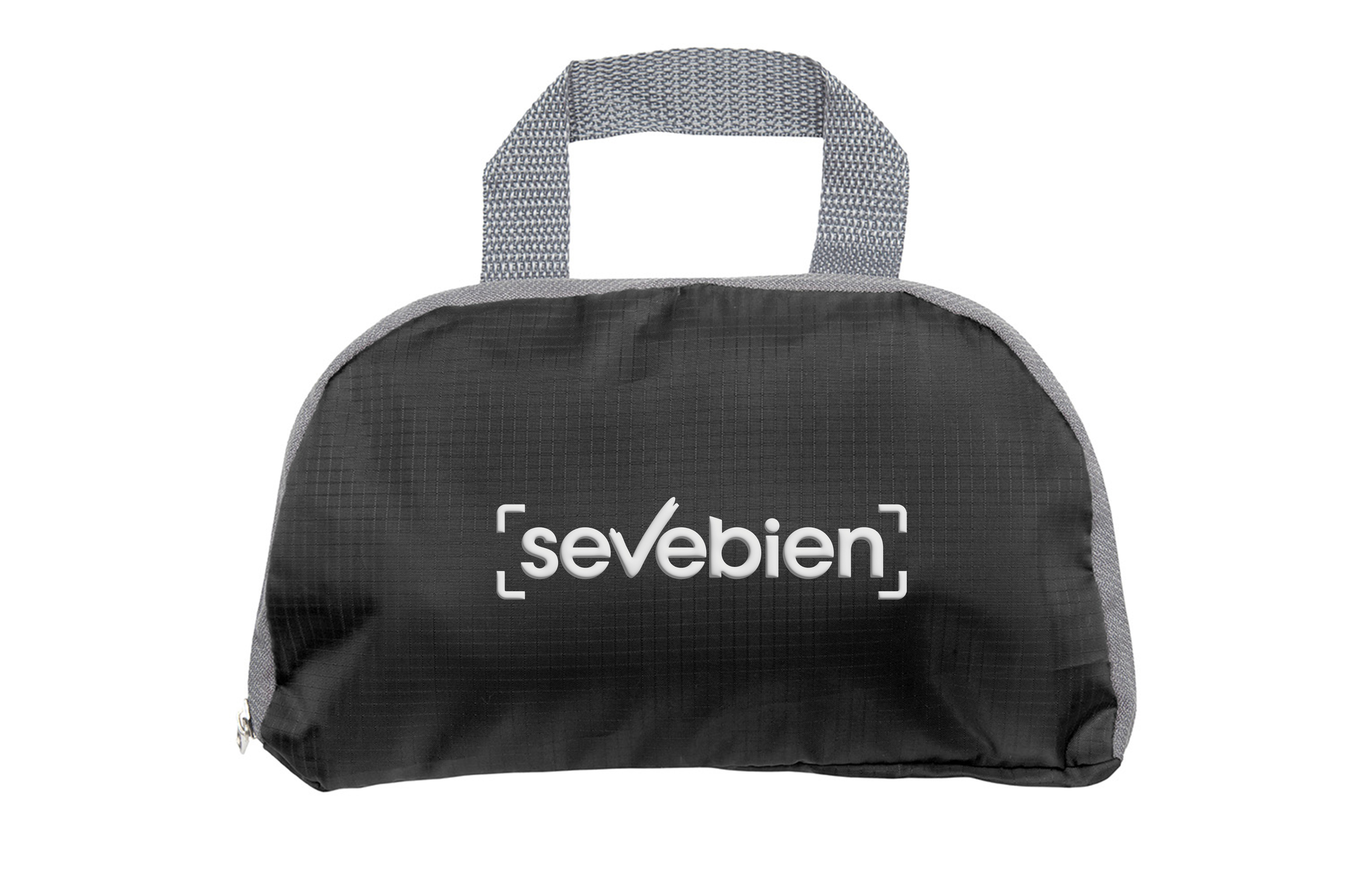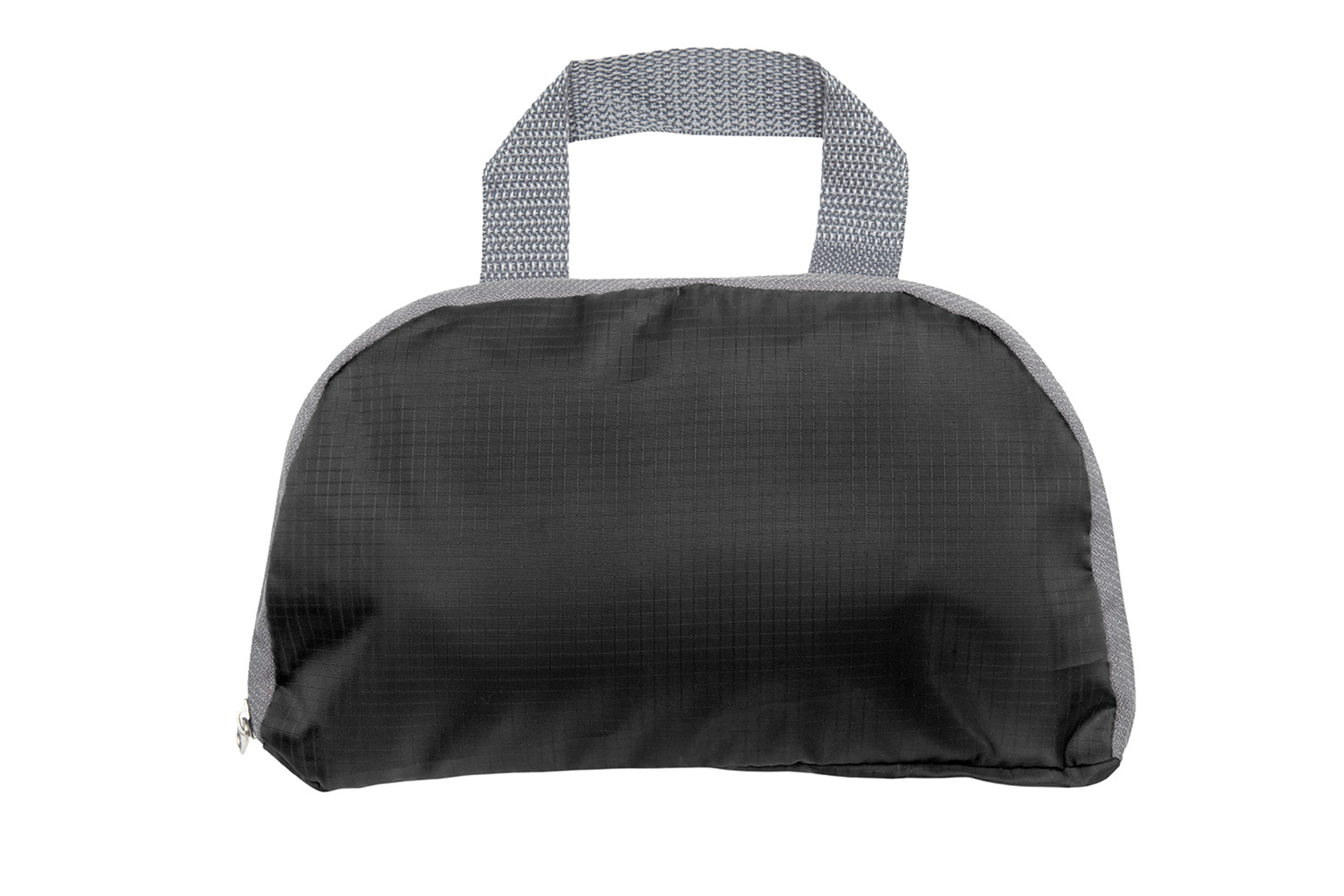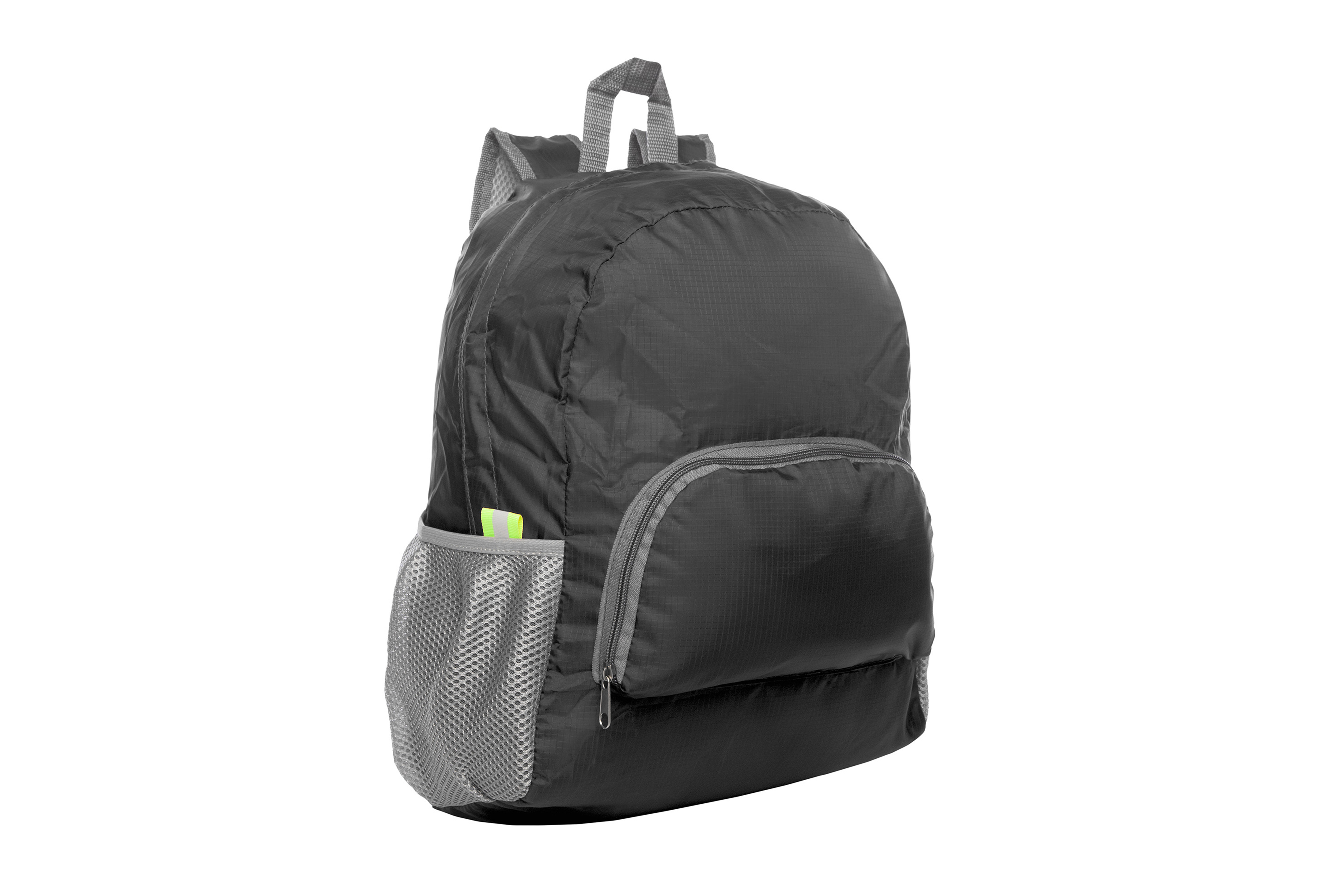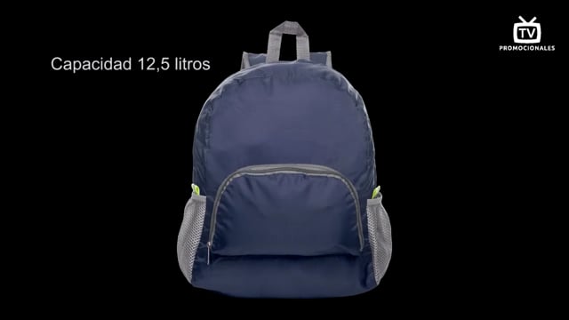 25 x 40 x 15,5 cm. (abierta). 23 x 13 x 2,5 cm (cerrada). Capacidad 12,5 litros aprox. Ripstop 210T (Tela ligera y resistente, de alta durabiidad y protección antidesgarro). Mochila plegable. Bolsillos laterales de red en color gris con tiras amarillas reflectivas en ambos lados. Detalles en gris en la manija y el cierre.