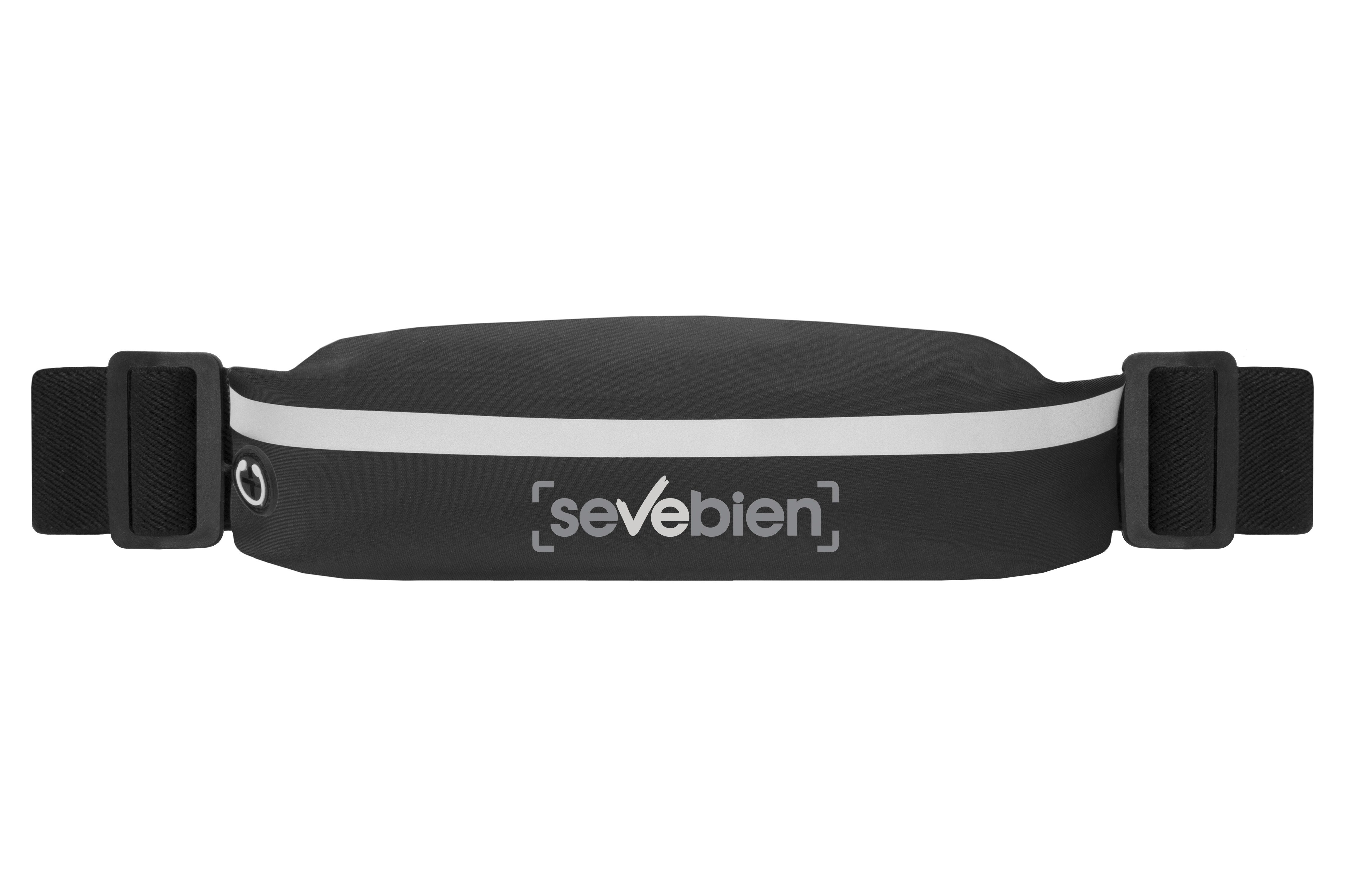23 cm. x 5 cm. Poliamida. cangurera / Riñonera deportiva. Unico compartimento con cierre metálico, salida para auriculares, faja reflectante y correas elásticas con longitud aproximada de 88 cm. El material es impermeable.