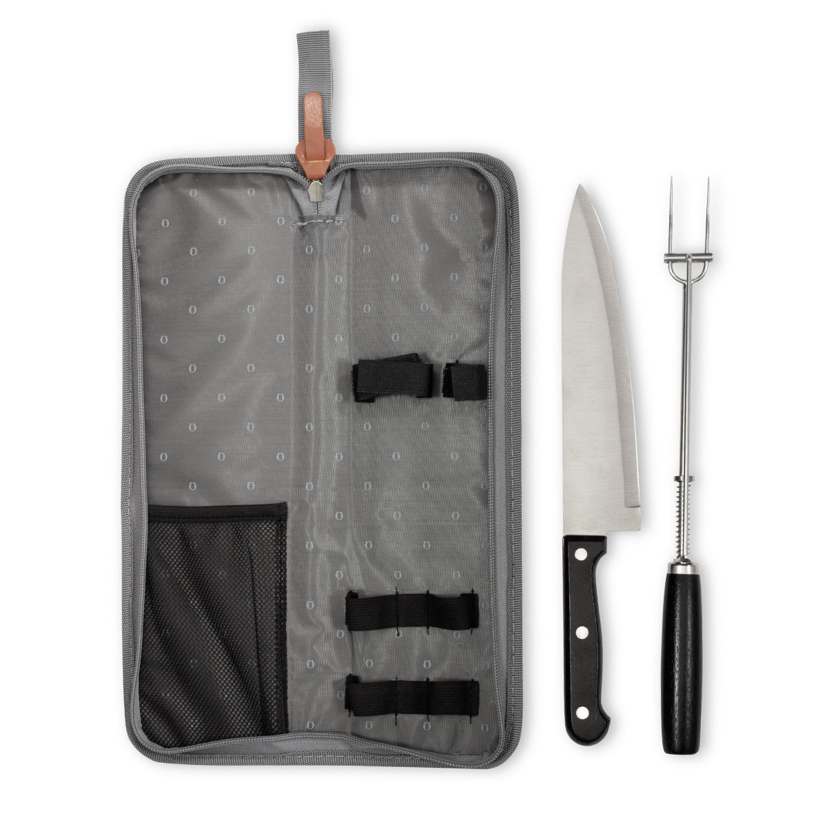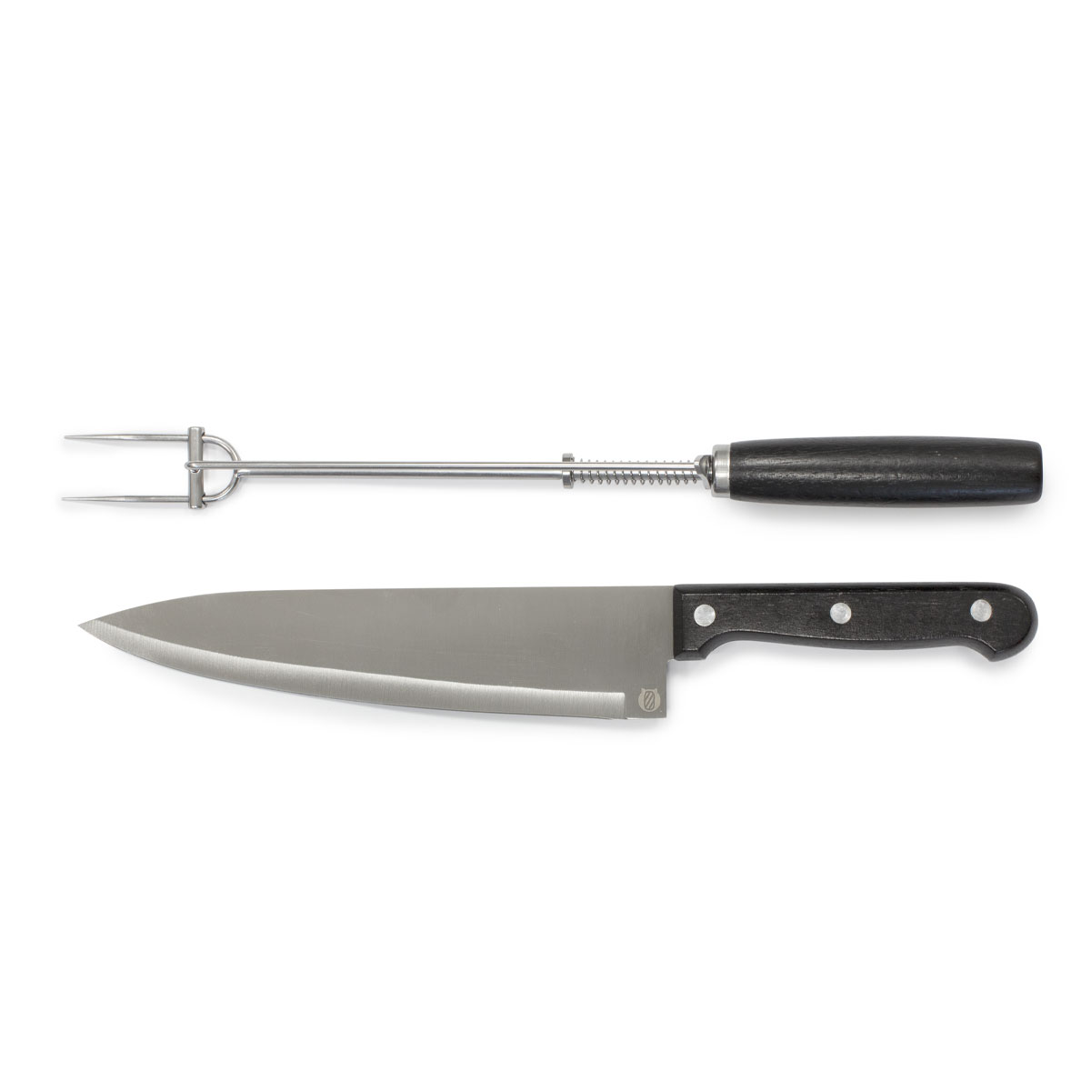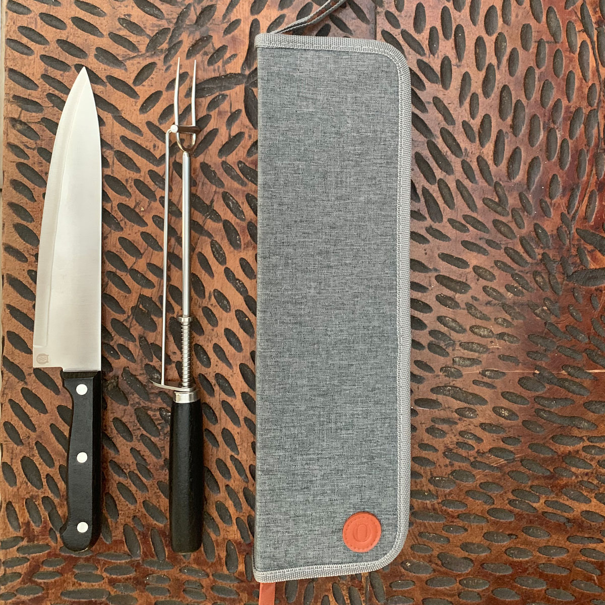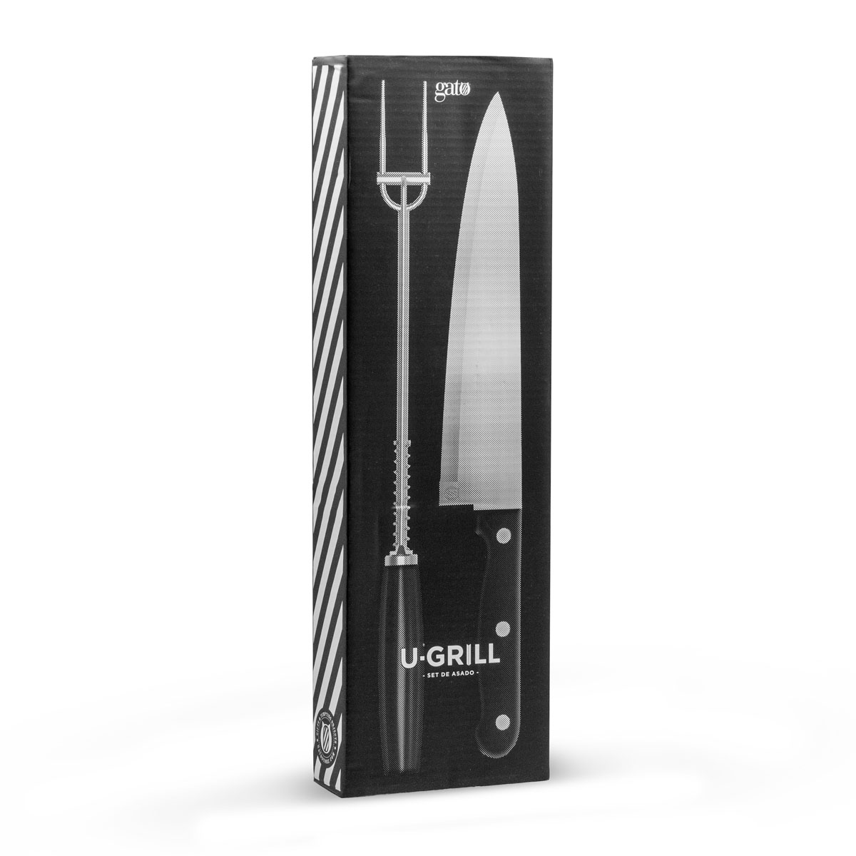 35,7 x 10,3 x 3,8 cm (estuche cerrado). Acero inoxidable 420 y madera de caucho + Poliéster. Set de 2 utensilios: cuchillo de 32,2 cm y tenedor con sistema de expulsión de 33 cm, ambos con mango de madera de caucho. Estuche de poliéster 300D color gris con cierre. Presentación en caja de regalo.
