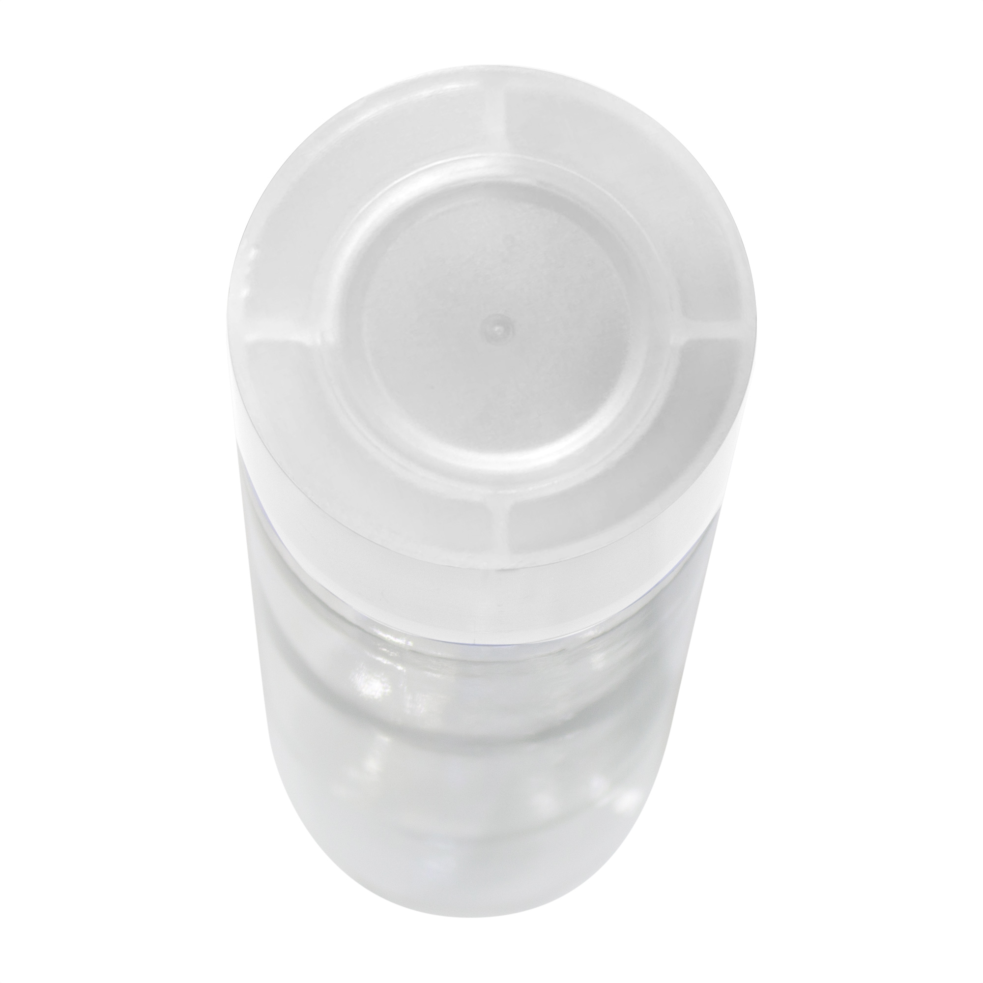 Botella de plástico transparente con tapa a rosca plástica.