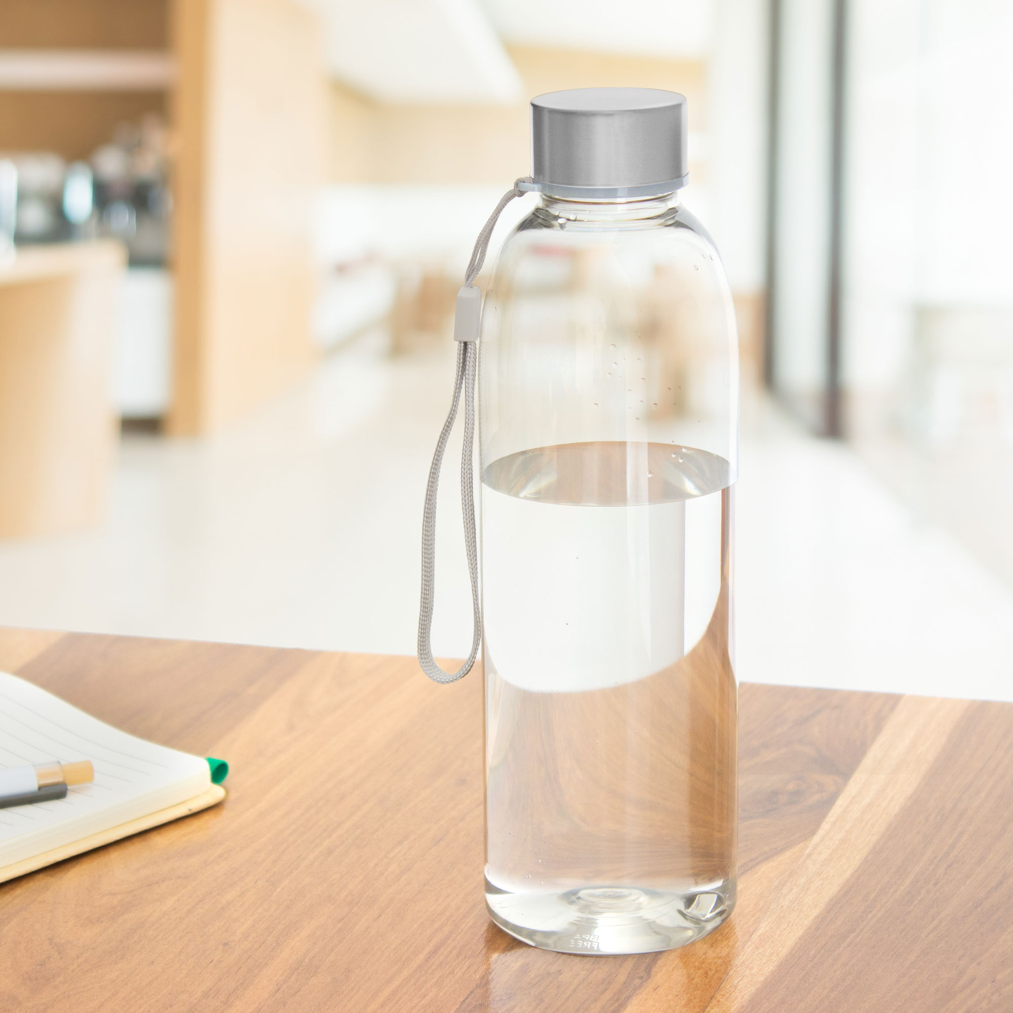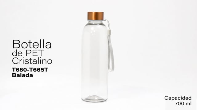 Ø 7 x 23 cm. Capacidad 700 ml. Peso de la botella 70 g y de la tapa 15g. Material PET Cristalino. Botella de plástico transparente con tapa a rosca de acero inoxidable, anillo de silicona antiderrame y correa para transportar.