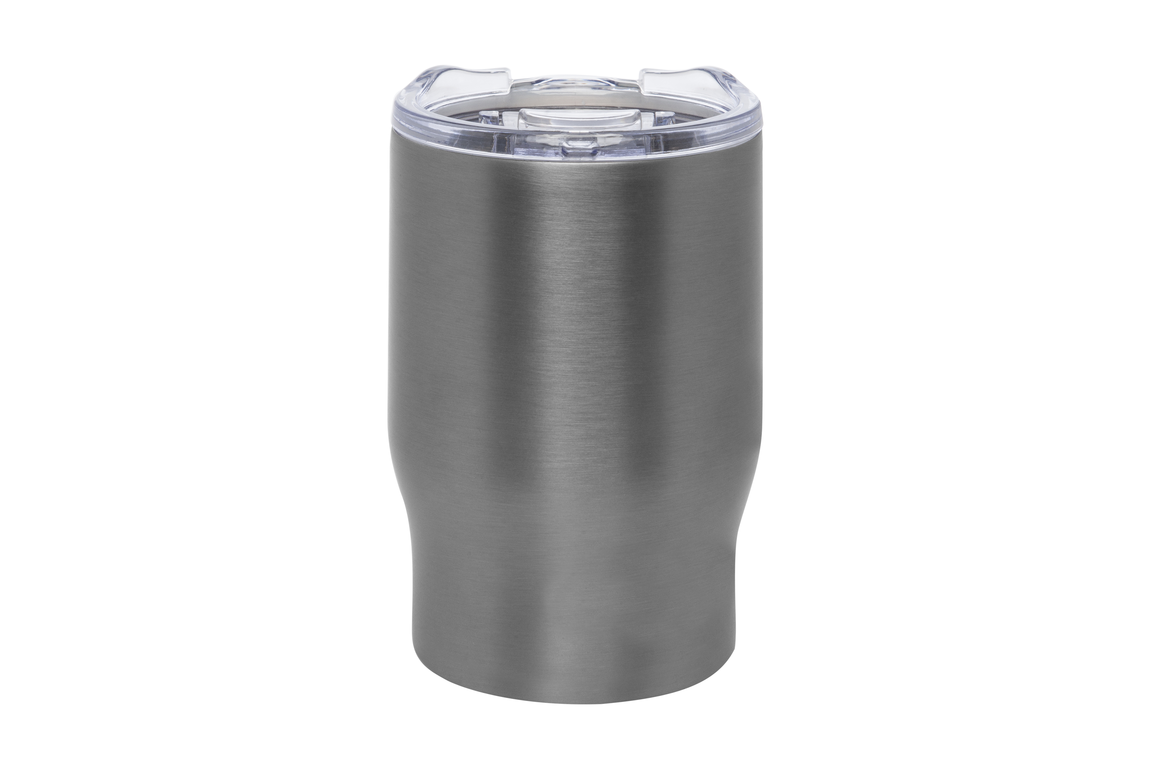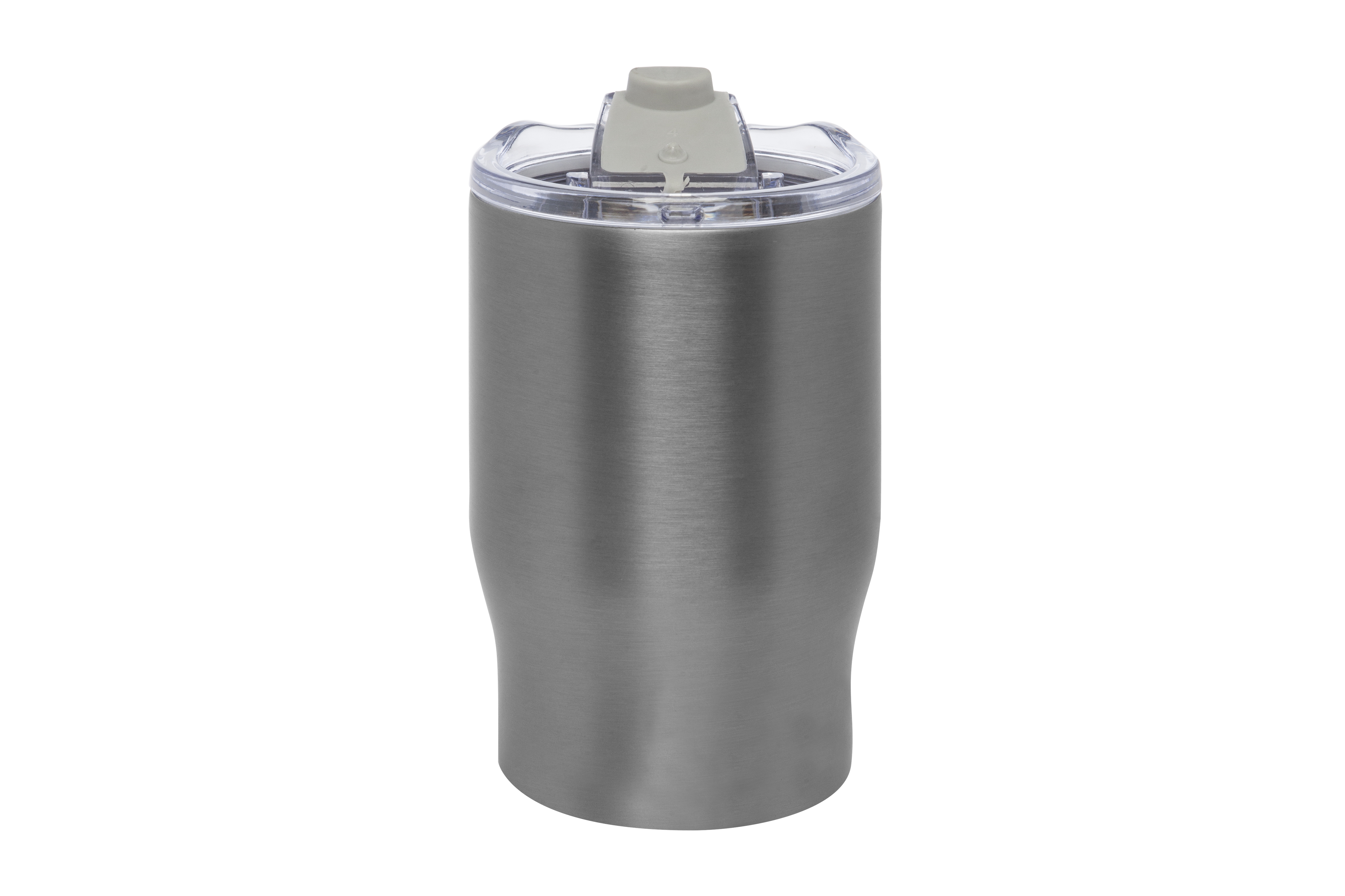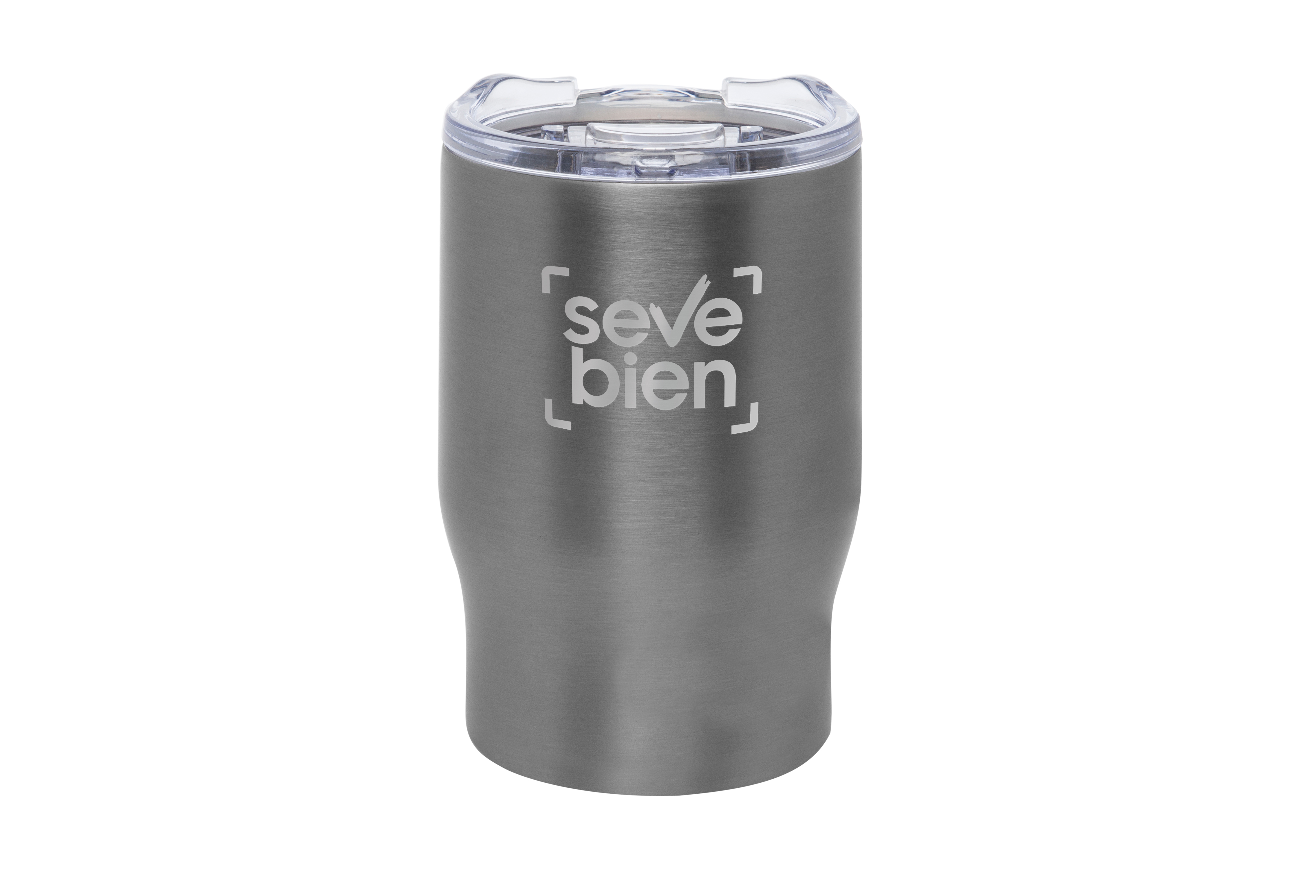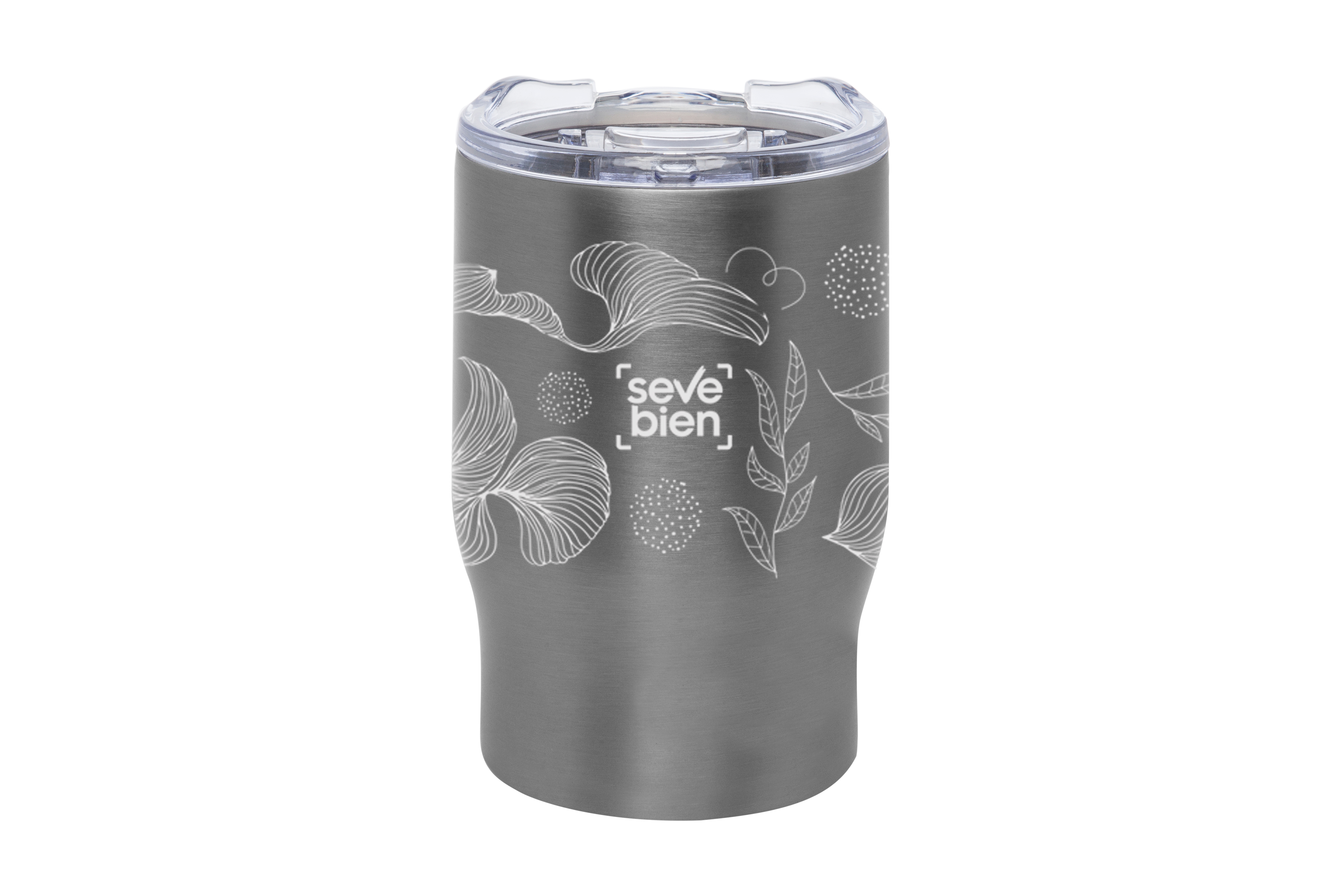 Ø 8,5 x 13,3 cm. Capacidad 350 ml. Acero inoxidable. Mug doble pared, sin tratamiento de vacío. Interior de acero 304 y exterior de acero 201. Tapa plástica transparente a presión con anillo de silicona. Mantienen las bebidas frías y calientes por más tiempo. No utilizar con bebidas gaseosas. Presentación en caja de regalo.