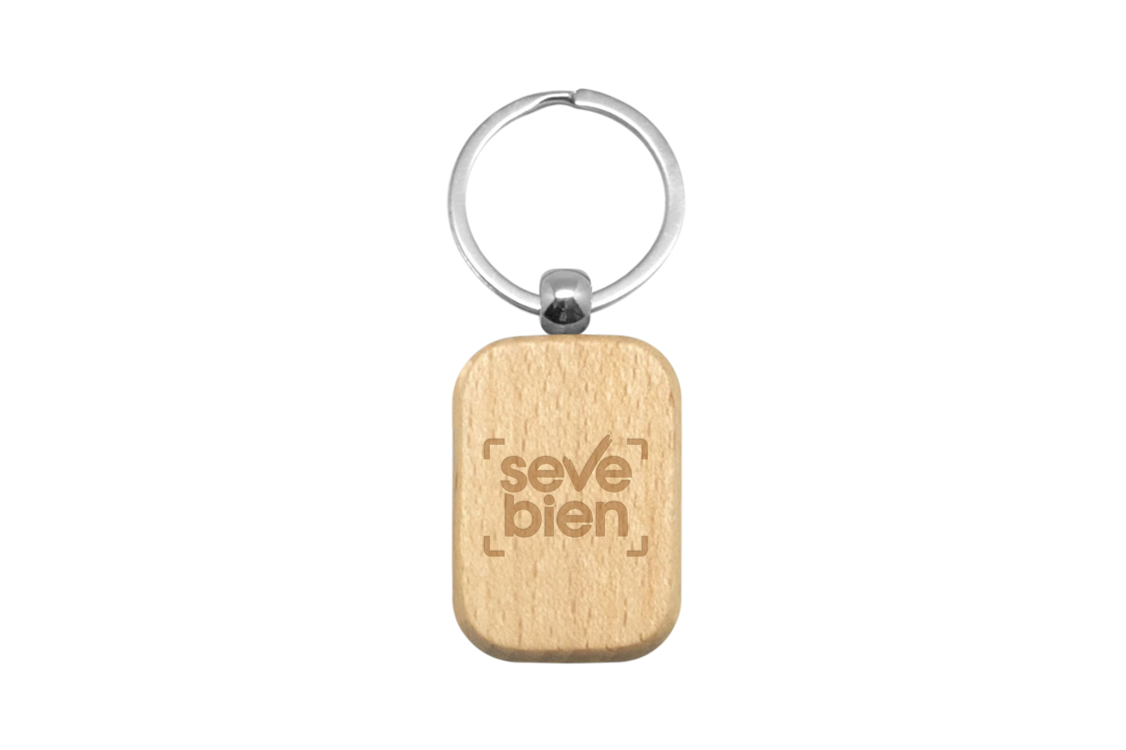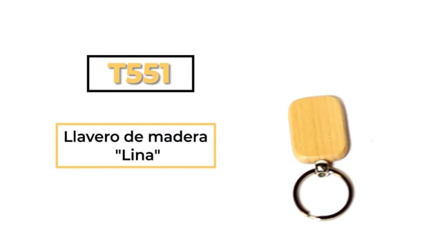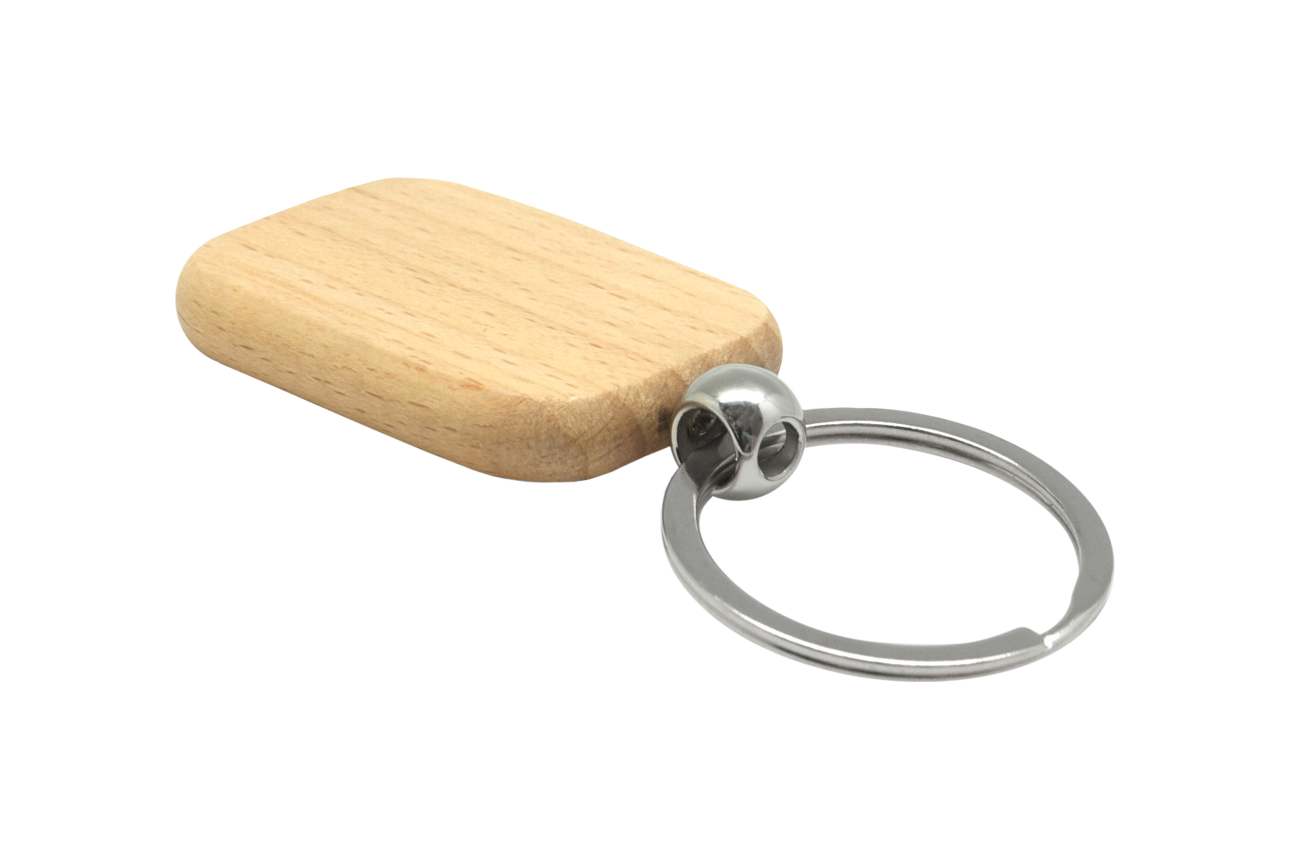Madera. 4,2 x 3 x 0,7 cm. Llavero rectangular con aro metálico (la medida no incluye el aro).