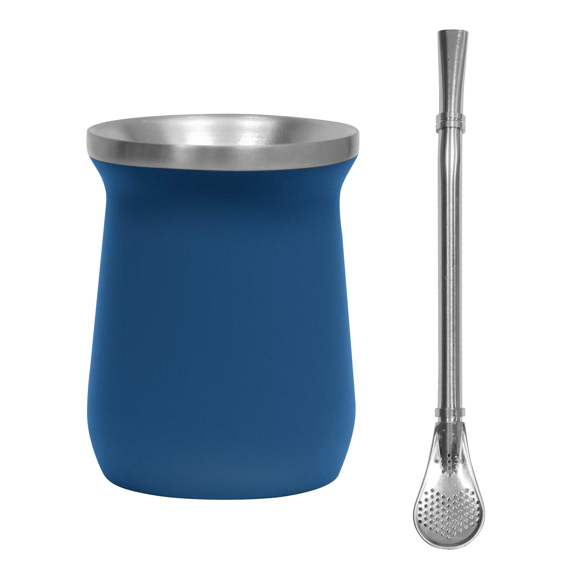 Ø 8 x 10,8 cm. Capacidad 300 ml. Mate Mug doble pared, sin tratamiento de vacío. Interior de acero 304 y exterior de acero 201. Mantiene la temperatura por más tiempo. Pintura Powder Coat (pintura mas duradera y resistente a la corrosión y el paso del tiempo). Bombilla de acero inoxidable 304 de 15,5 cm. Presentación en caja de regalo Kraft.