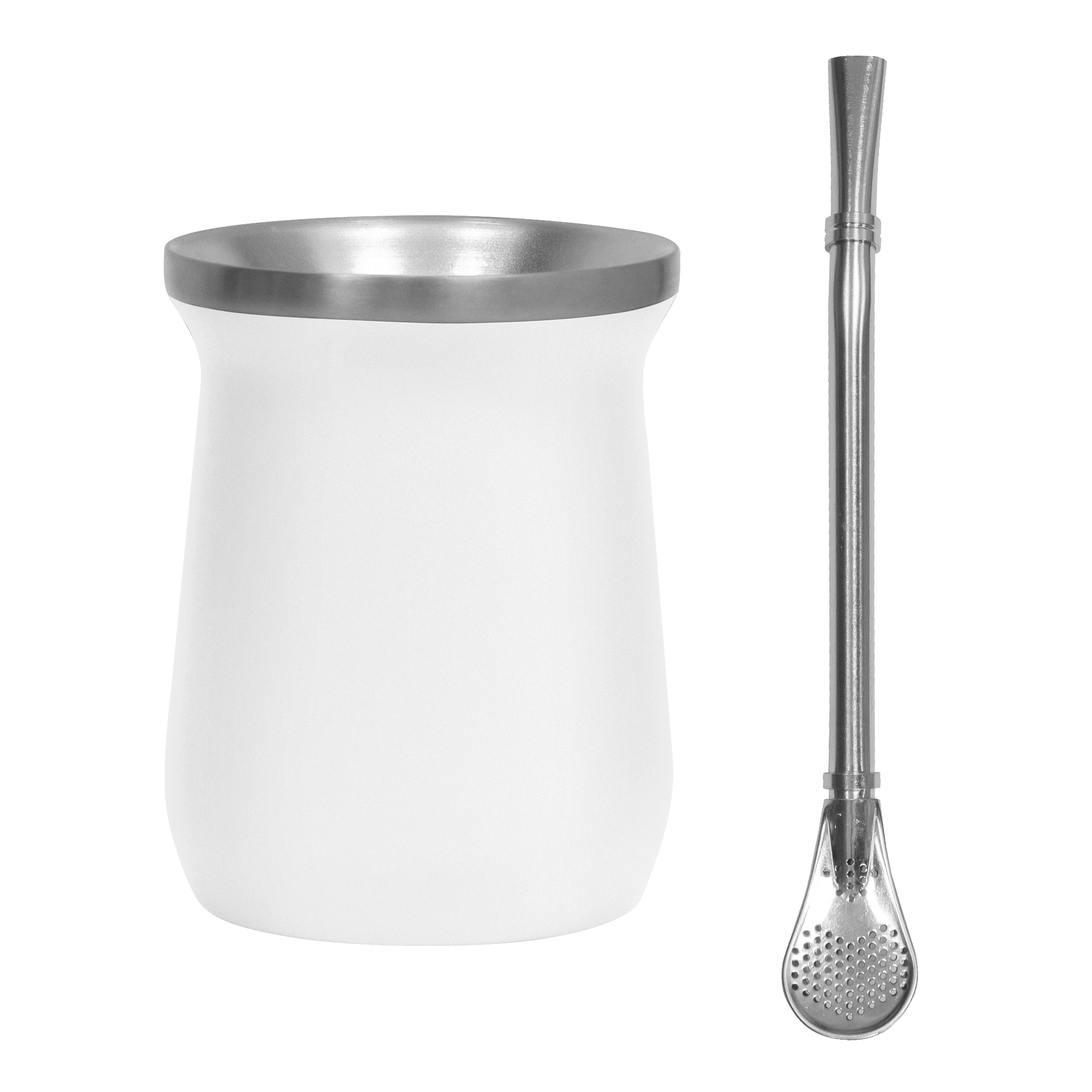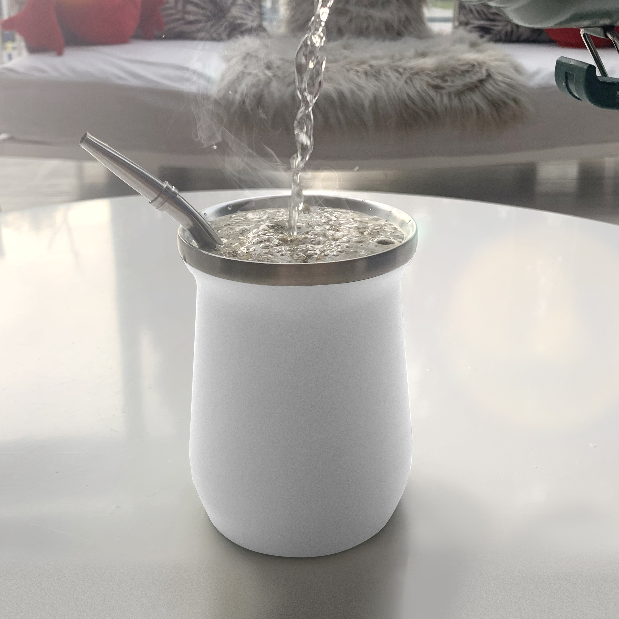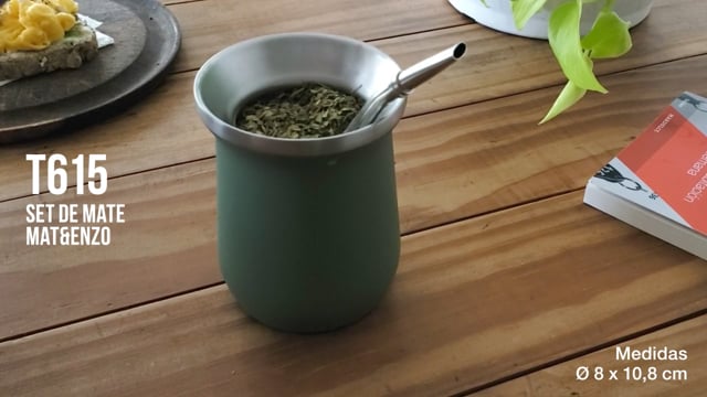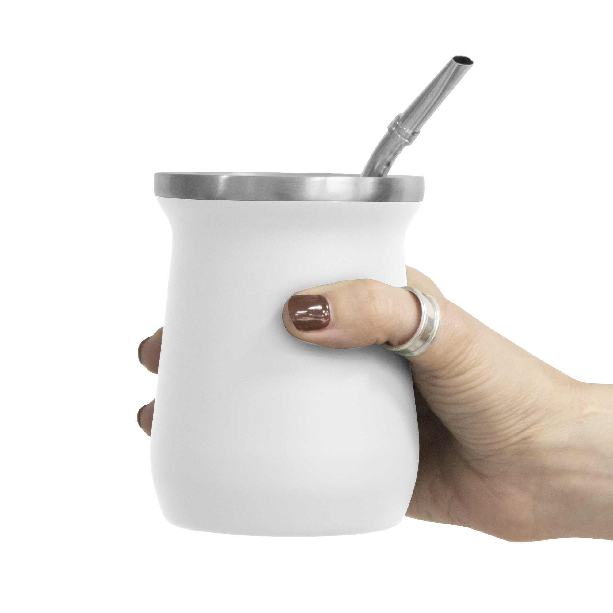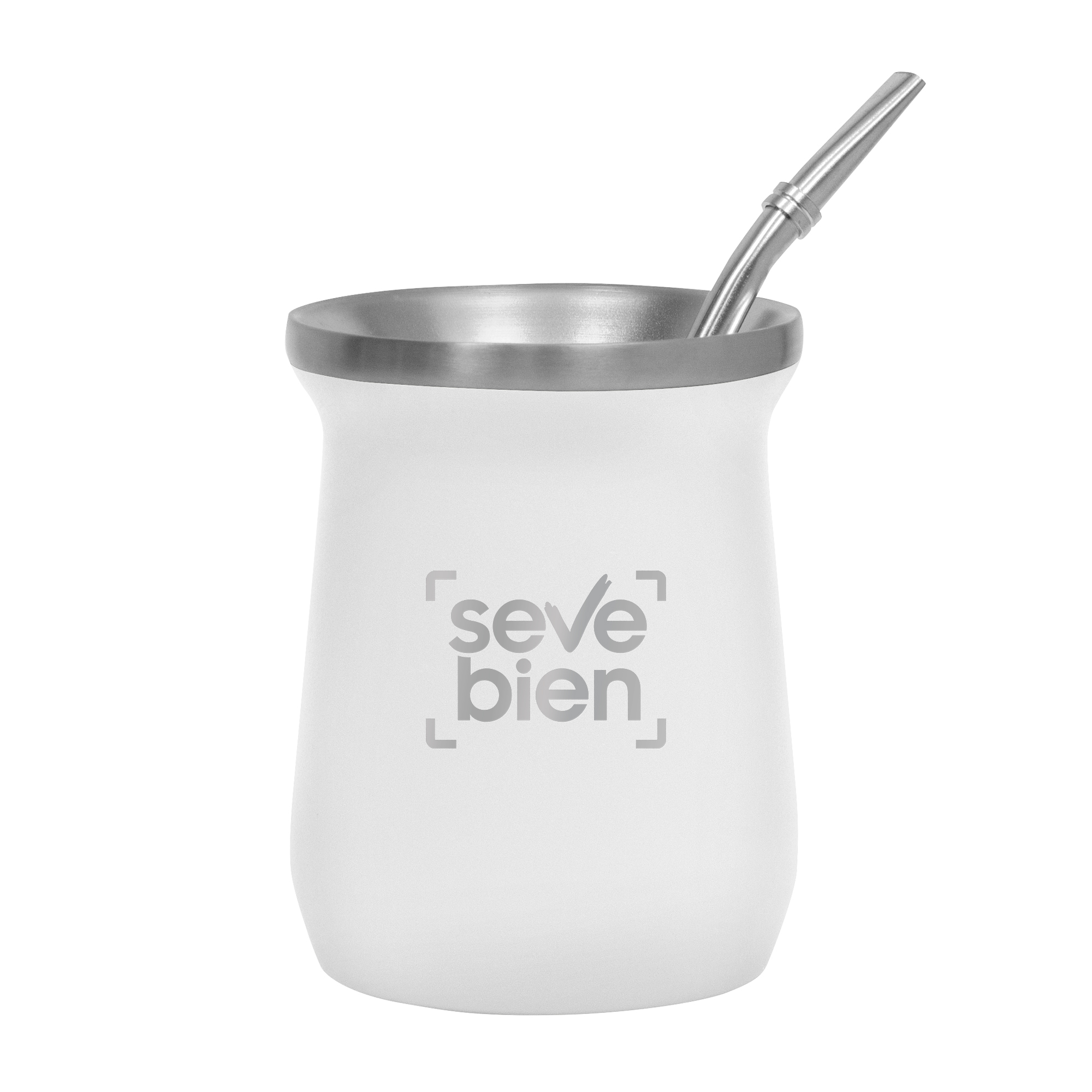 Ø 8 x 10,8 cm. Capacidad 300 ml. Mate Mug doble pared, sin tratamiento de vacío. Interior de acero 304 y exterior de acero 201. Mantiene la temperatura por más tiempo. Pintura Powder Coat (pintura mas duradera y resistente a la corrosión y el paso del tiempo). Bombilla de acero inoxidable 304 de 15,5 cm. Presentación en caja de regalo Kraft.
