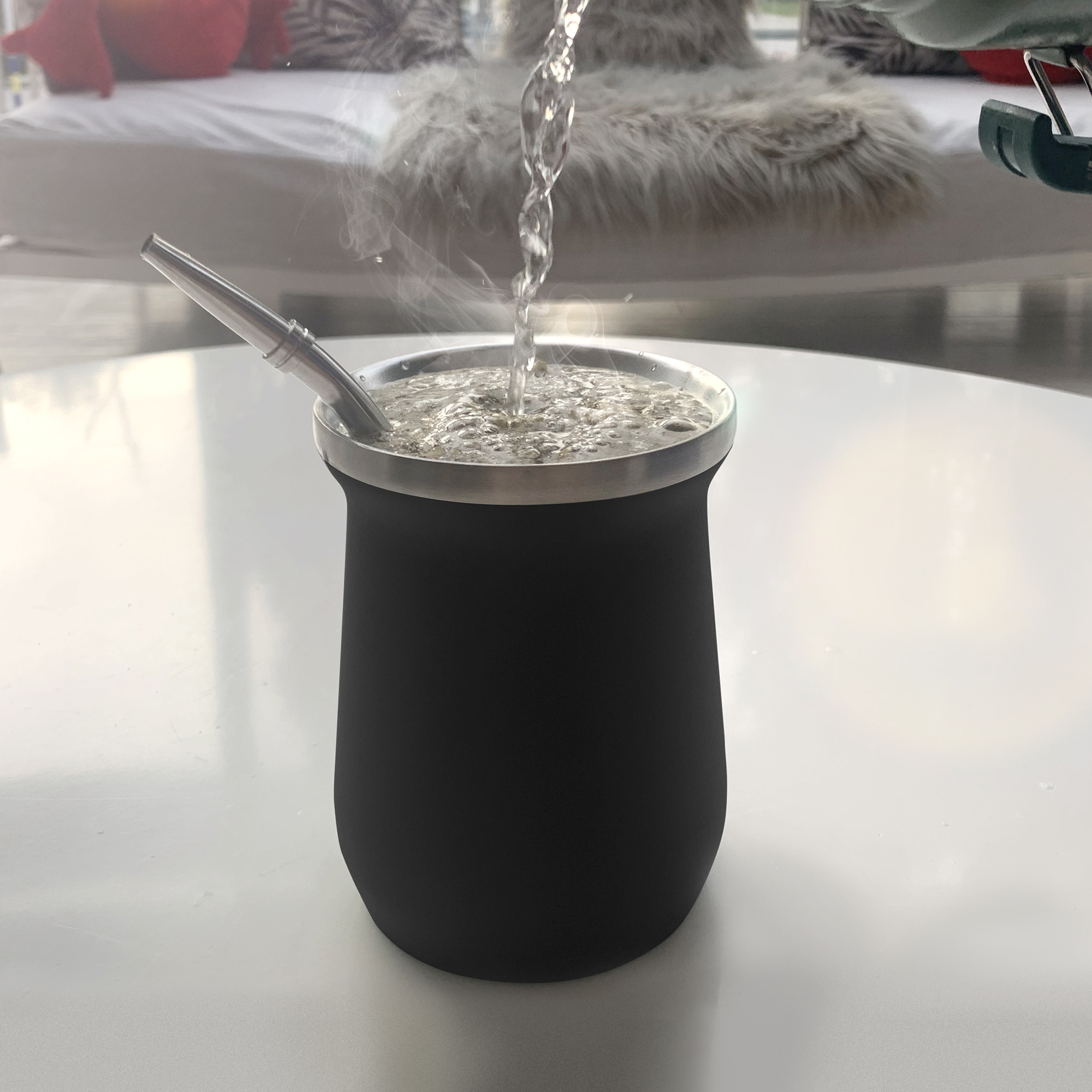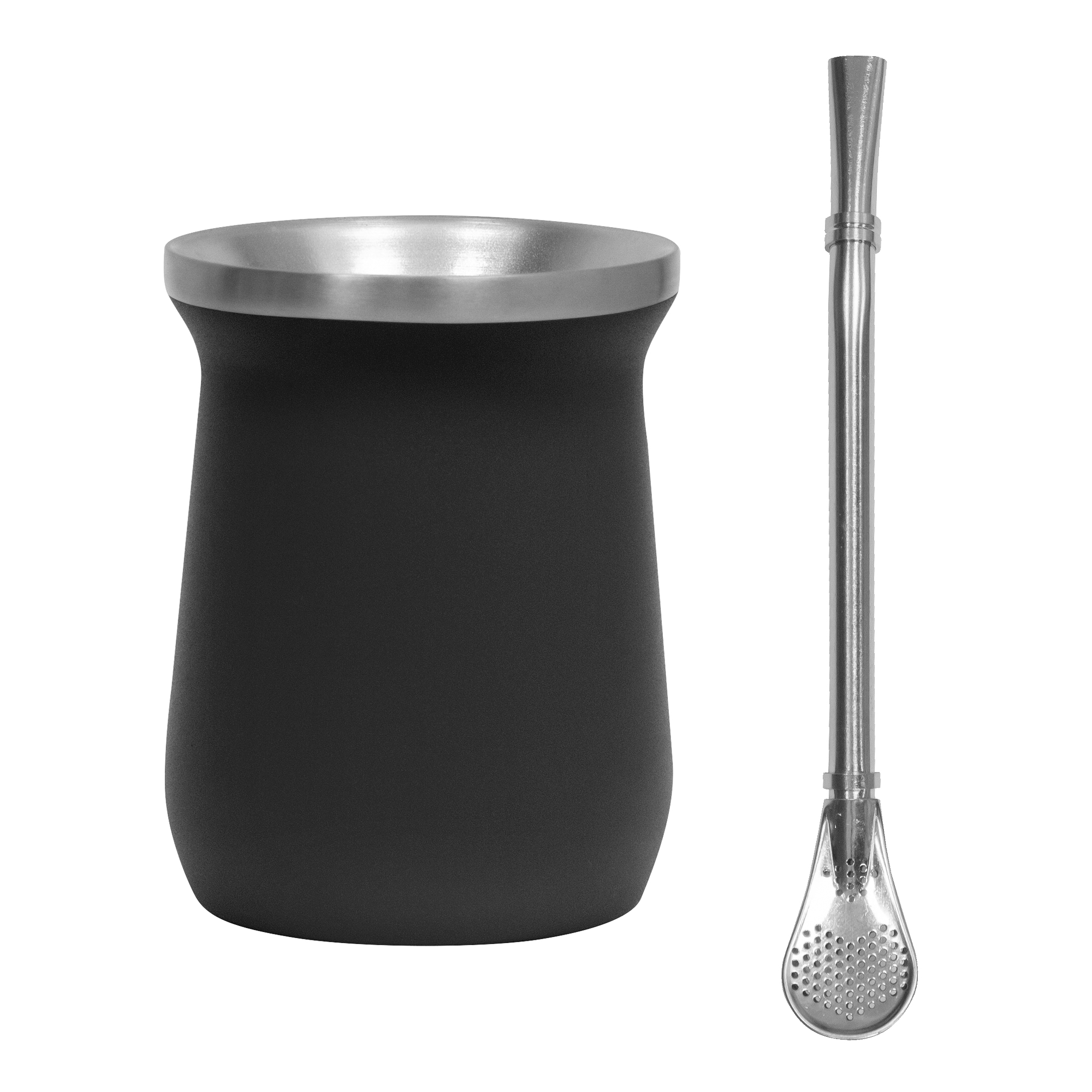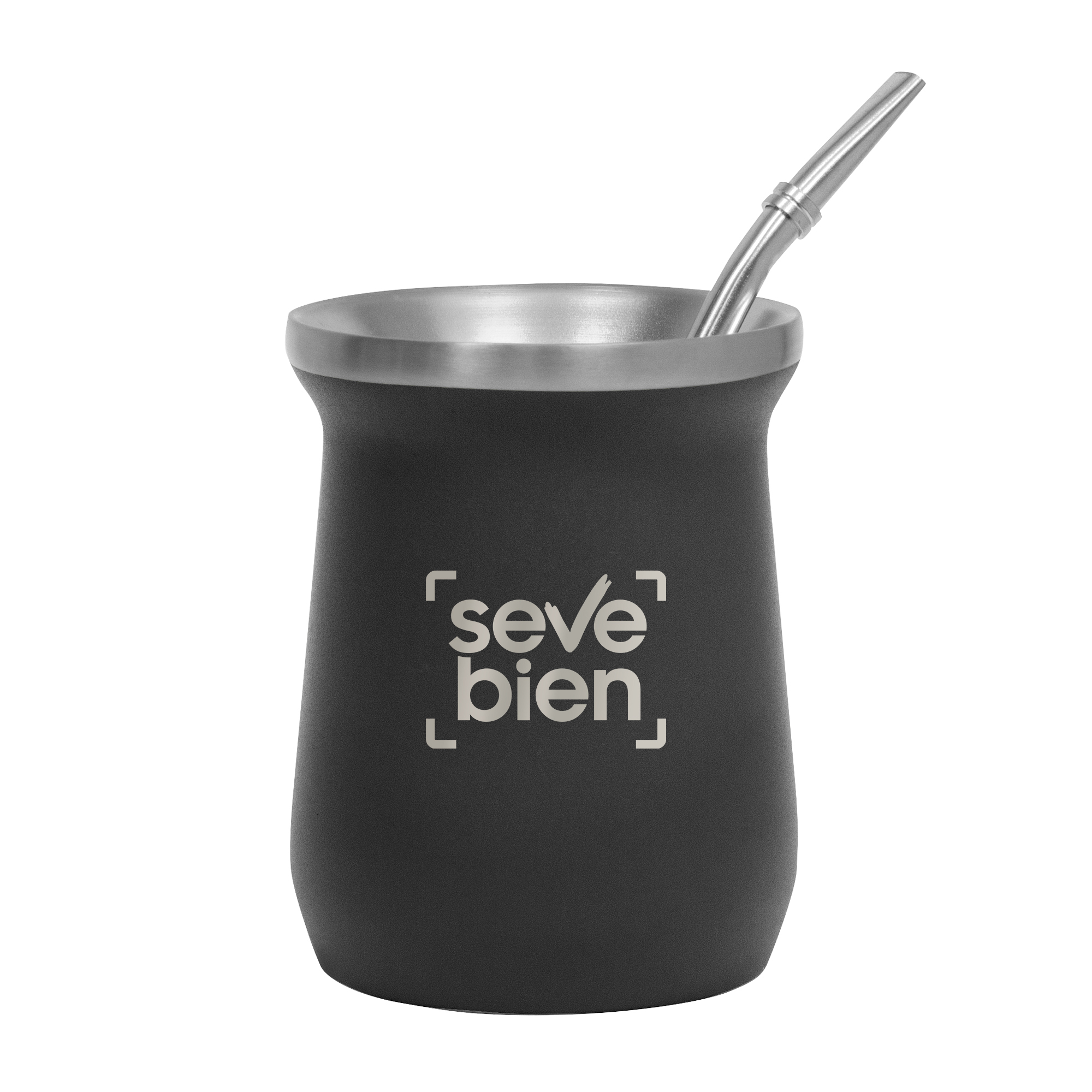 Ø 8 x 10,8 cm. Capacidad 300 ml. Mate Mug doble pared, sin tratamiento de vacío. Interior de acero 304 y exterior de acero 201. Mantiene la temperatura por más tiempo. Pintura Powder Coat (pintura mas duradera y resistente a la corrosión y el paso del tiempo). Bombilla de acero inoxidable 304 de 15,5 cm. Presentación en caja de regalo Kraft.