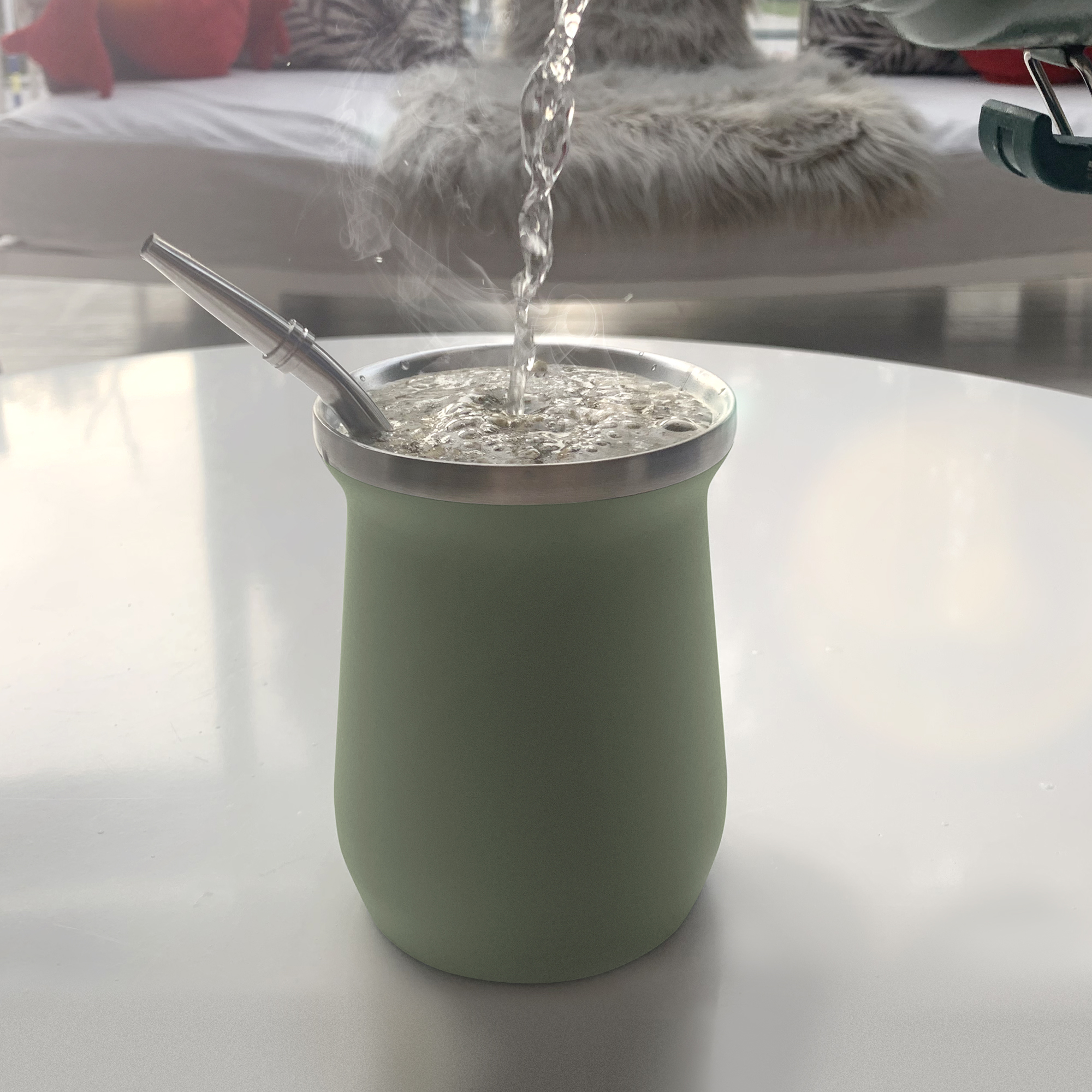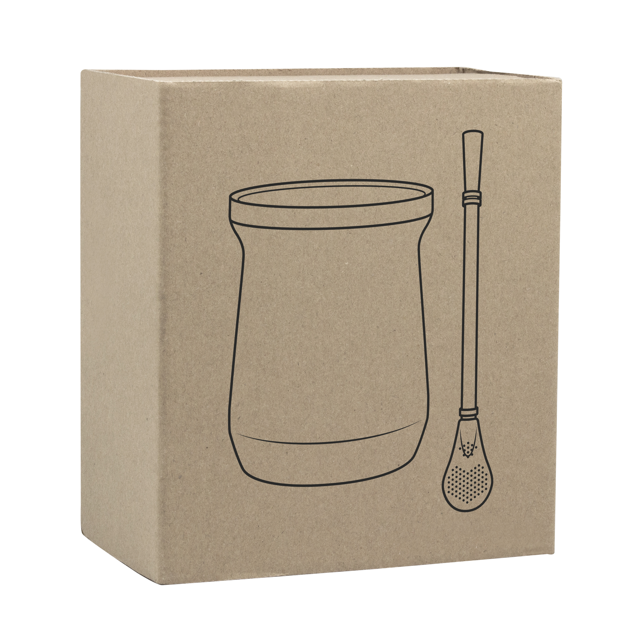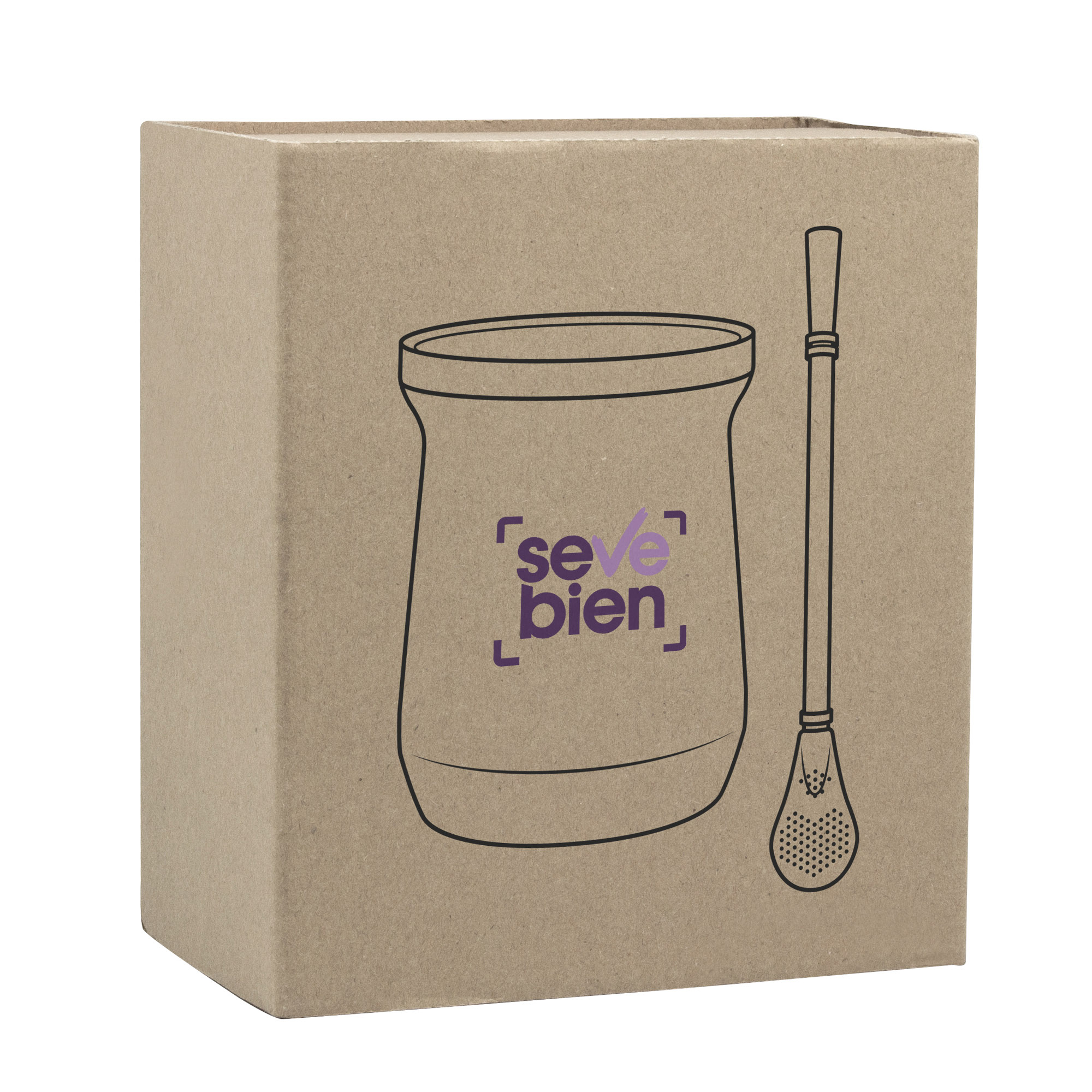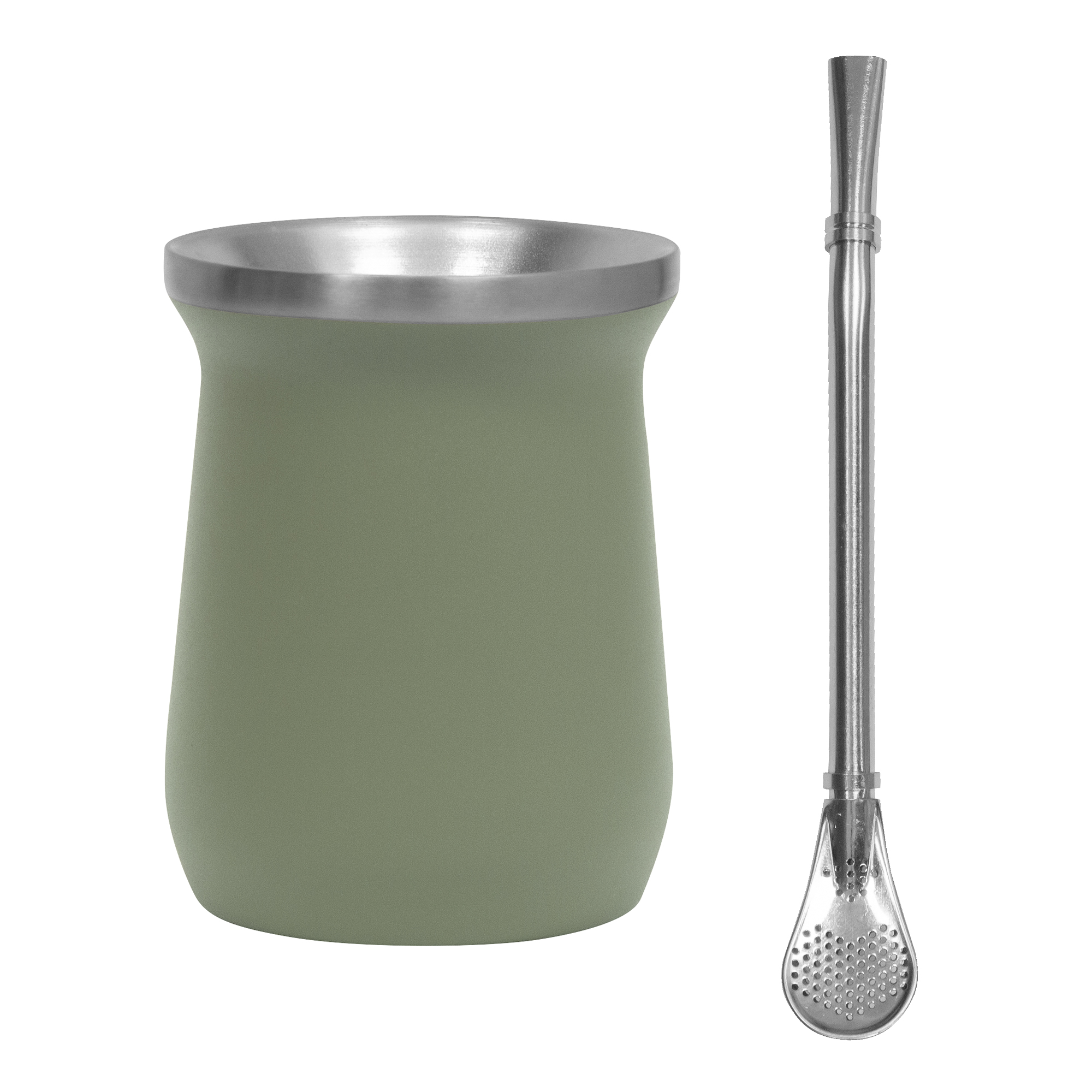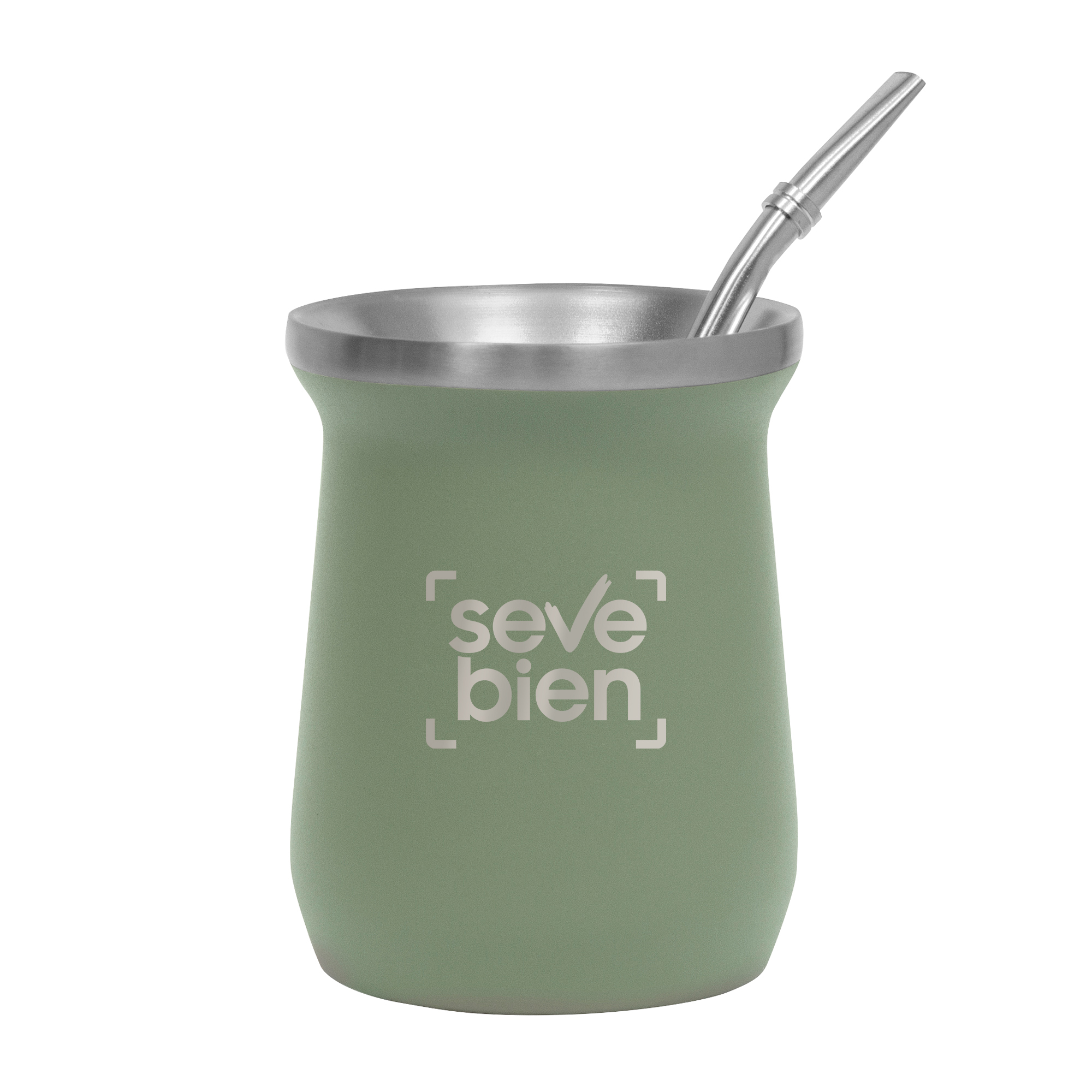 Ø 8 x 10,8 cm. Capacidad 300 ml. Mate Mug doble pared, sin tratamiento de vacío. Interior de acero 304 y exterior de acero 201. Mantiene la temperatura por más tiempo. Pintura Powder Coat (pintura mas duradera y resistente a la corrosión y el paso del tiempo). Bombilla de acero inoxidable 304 de 15,5 cm. Presentación en caja de regalo Kraft.